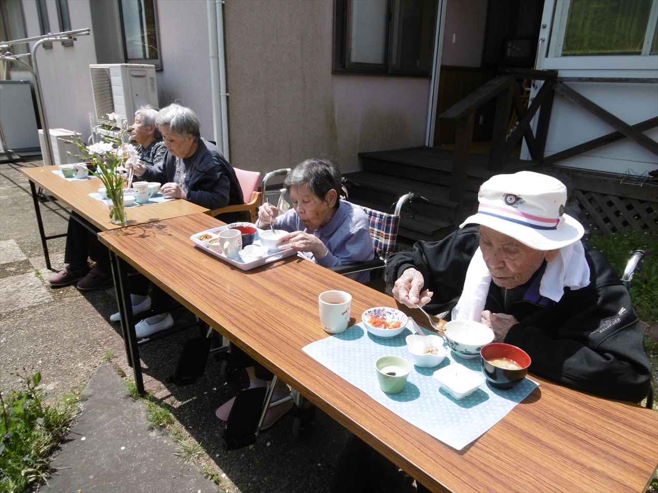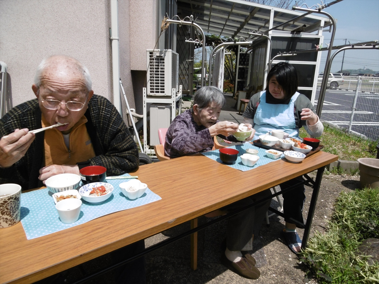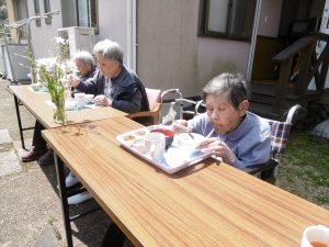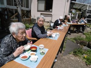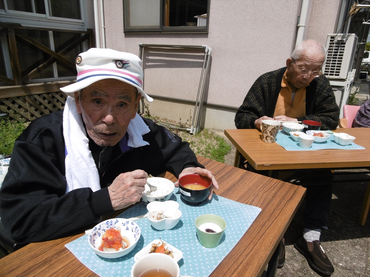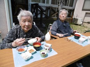 お庭にて青空昼食 花の里(1階) 2017.04.17 桜の花も散る頃、風に舞う花びらの中昼食を食べました。 青空の下でのご飯はやっぱり美味しい! お花見 ふるさと(1階) 前の記事 誕生日のお祝い外出 ふるさと(1階) 次の記事