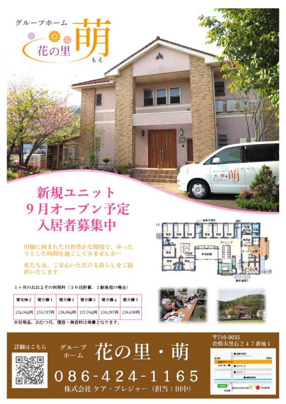 新規ユニットオープン予定! 2017.05.1 花の里・萌の2階を新規ユニットとして9月に開設予定です。 ご見学希望の方は随時受け付けておりますので、お気軽にお問い合わせください。 なお、ご入居をお急ぎの方も現在空室がございますのでご相談ください。 お問合せお待ちしております。 News Letter Vol.01 前の記事 萌新聞 花の里 29年4月号 次の記事