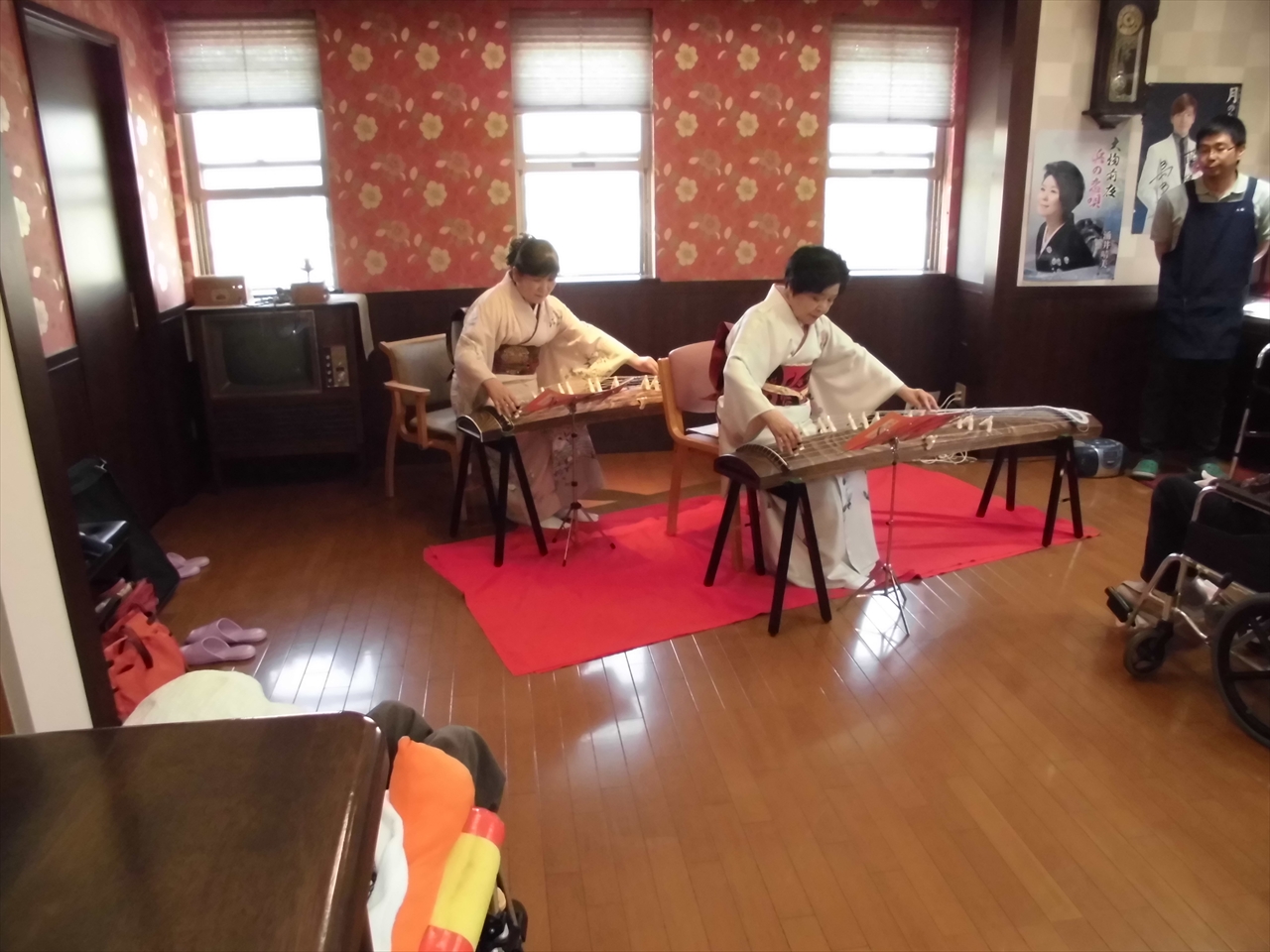 本日、ボランティアの方々が琴の演奏と舞踊を披露して下さいました。ふるさと萌の二階にある多目的ホールに、ふるさと・花の里の入居者様全員が集まり観賞しました。琴の演奏では知っておられる演奏をみんなで一緒に歌い、舞踊では皆様真剣に見入っておられ、楽しいひと時を過ごすことが出来ました。