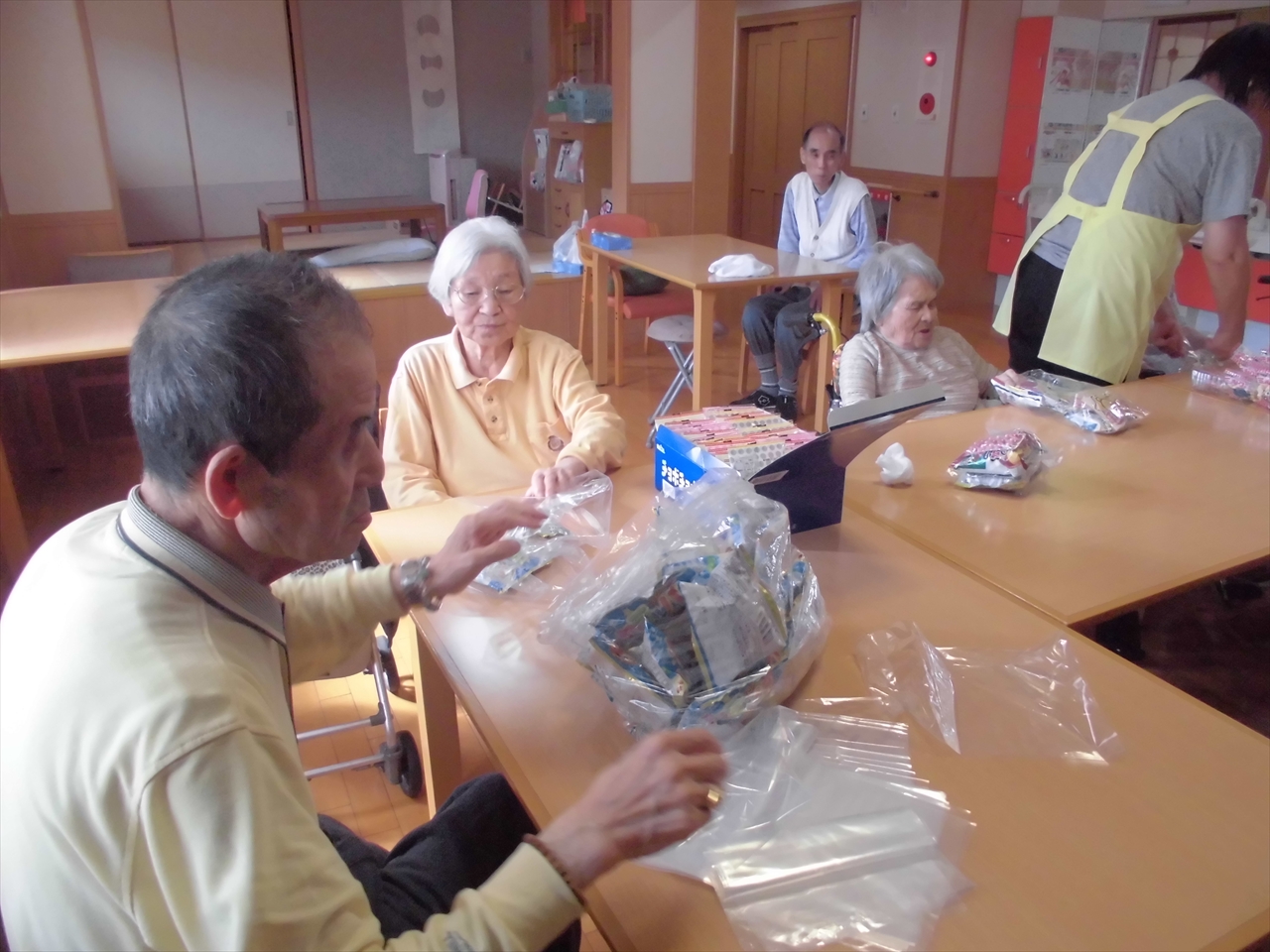 頑張っている園児に喜んでもらいたくて、事前にみんなでお菓子の袋詰めをしました。