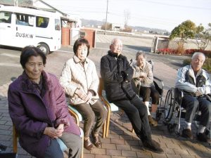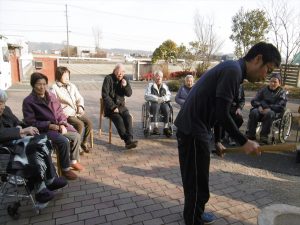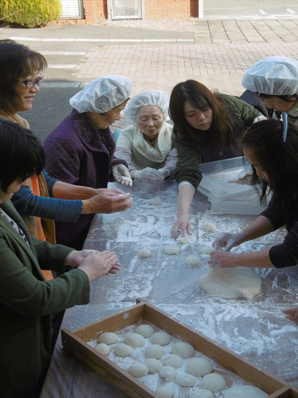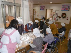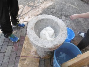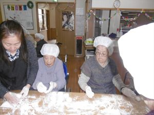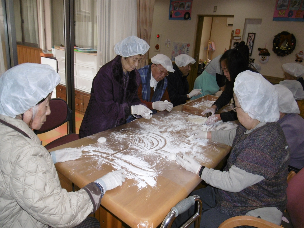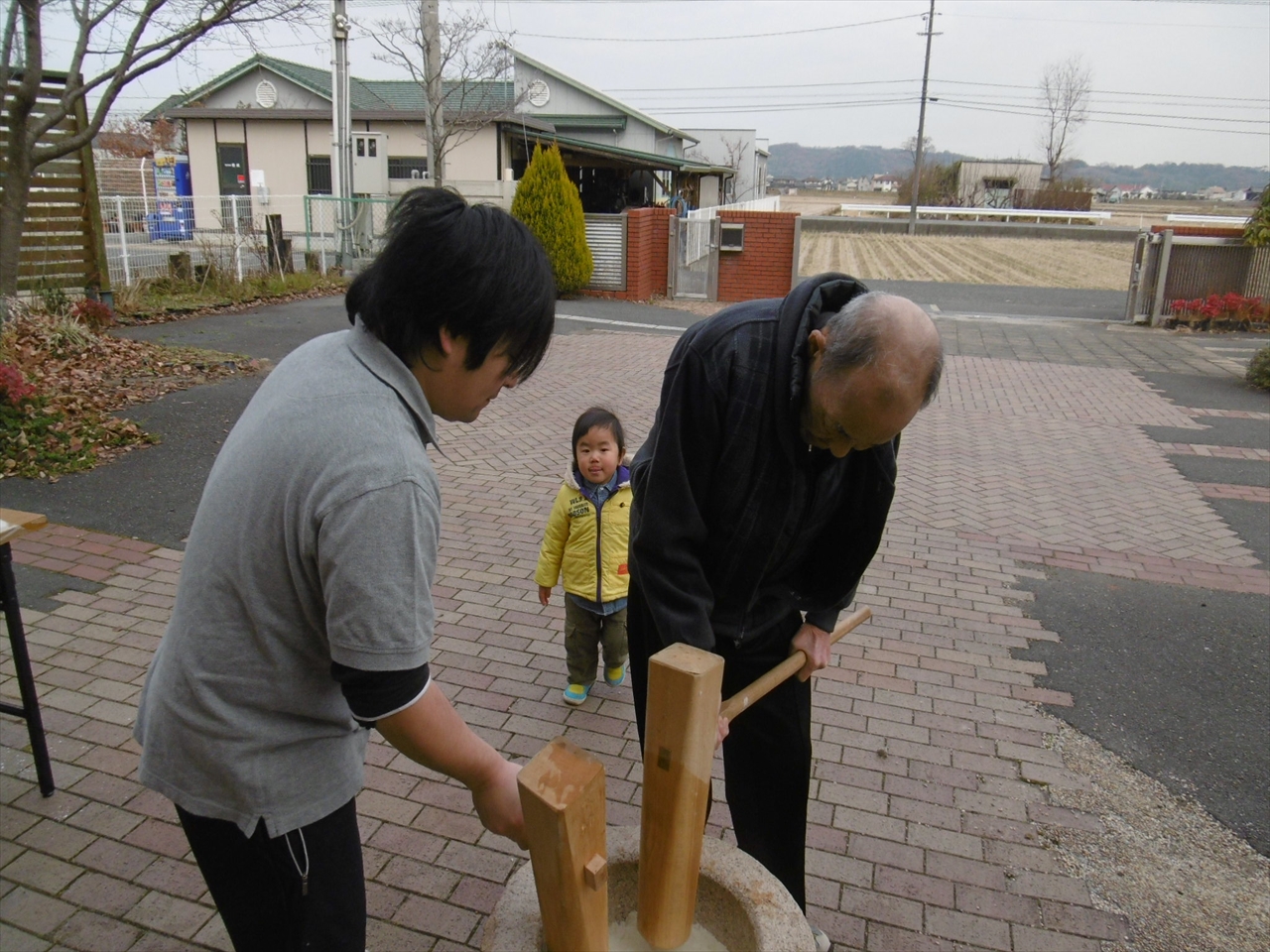 男性入居者は杵で餅をつき、女性入居者は外と中に分かれてつきたての餅を丸め、皆さんに協力してもらいました。