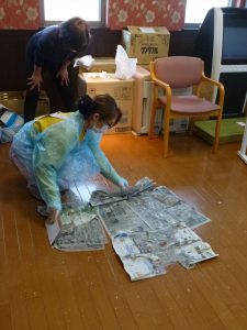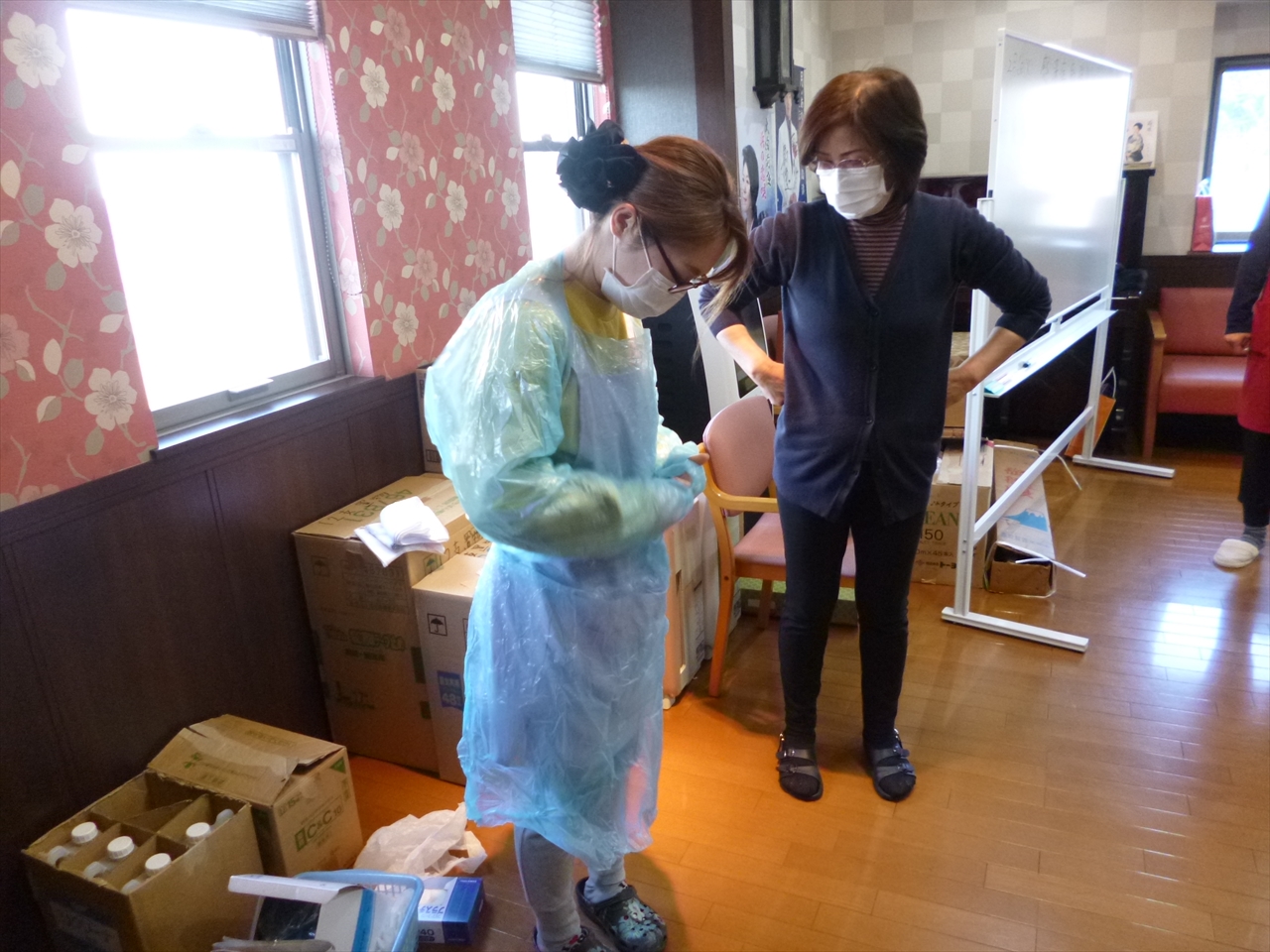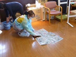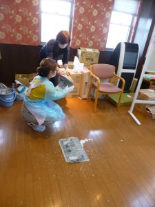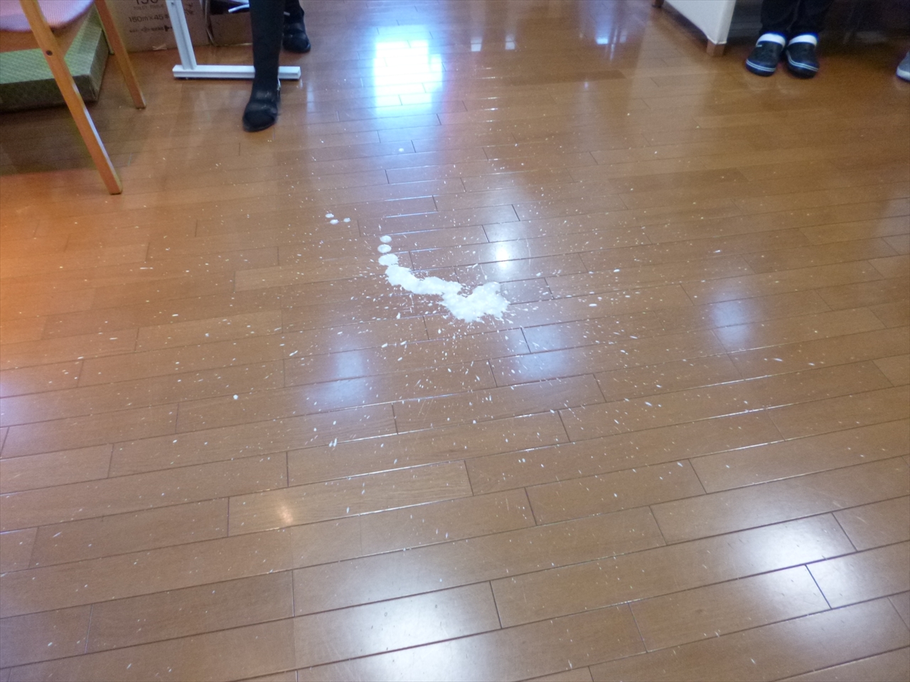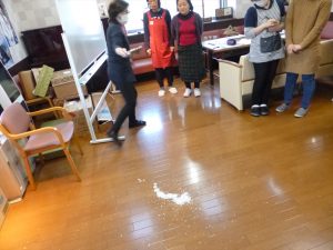 当施設の看護師に講義をしてもらってから、小麦粉を使用して、正しい吐物の処理の仕方を演習として行いました。