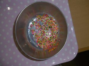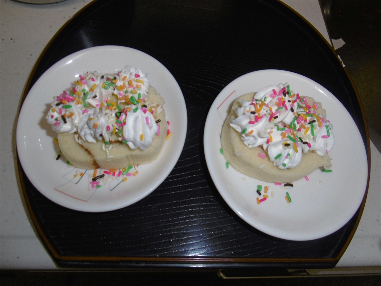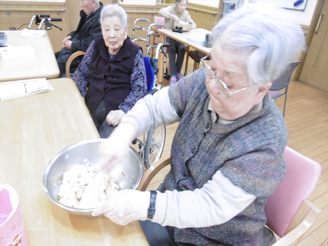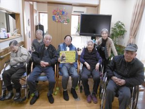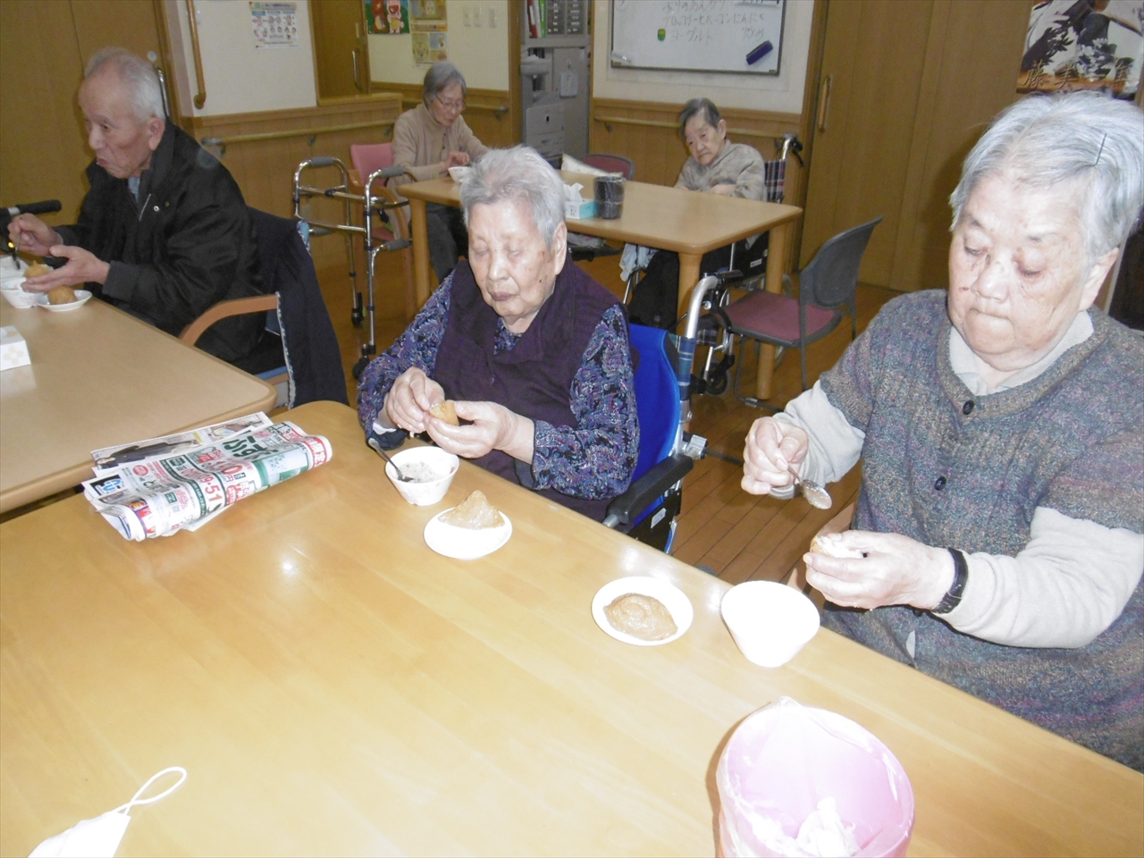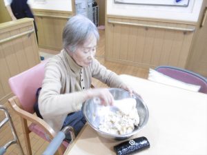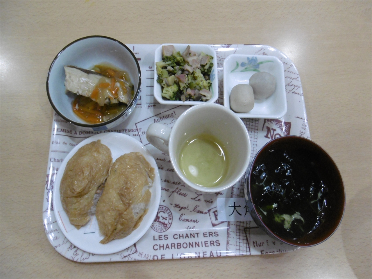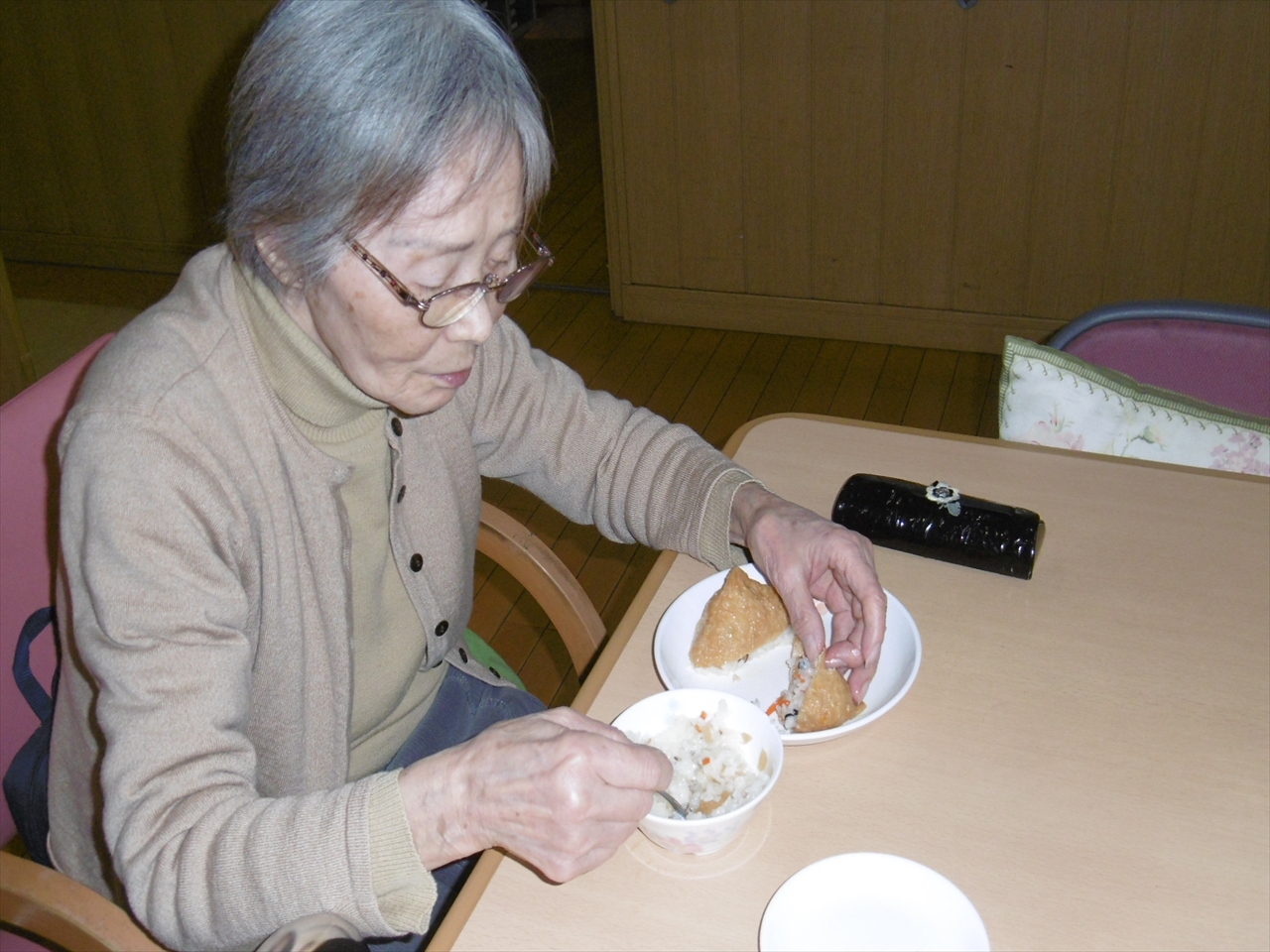 昼食には稲荷寿司、おやつにはロールケーキに生クリームとチョコチップでトッピングをして皆さんでお祝いしました。稲荷寿司は自分の物は詰めてもらいました。中には揚げに詰めるより自分の口の中に多く入る方もおられましたが…(笑)
