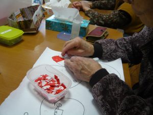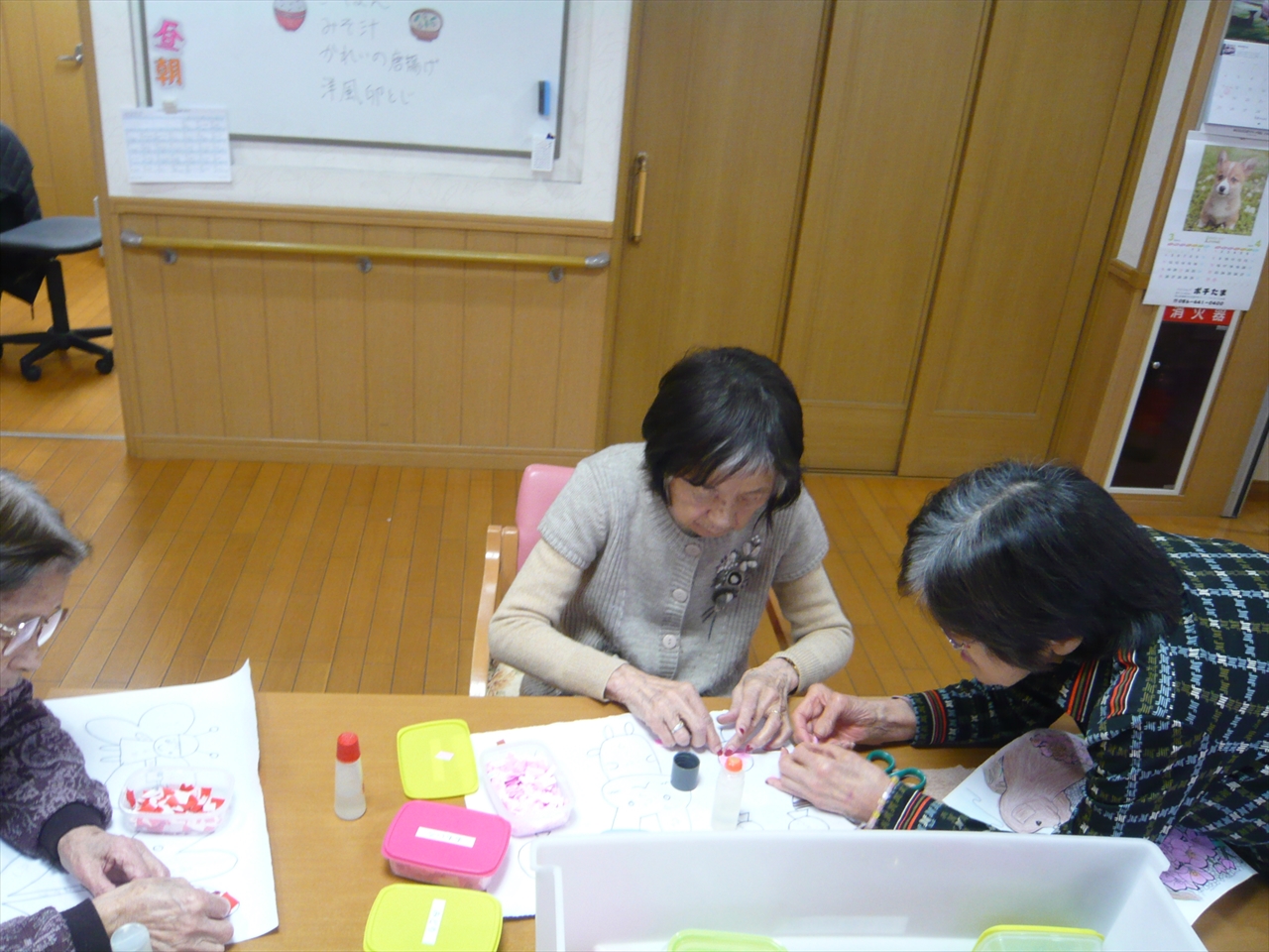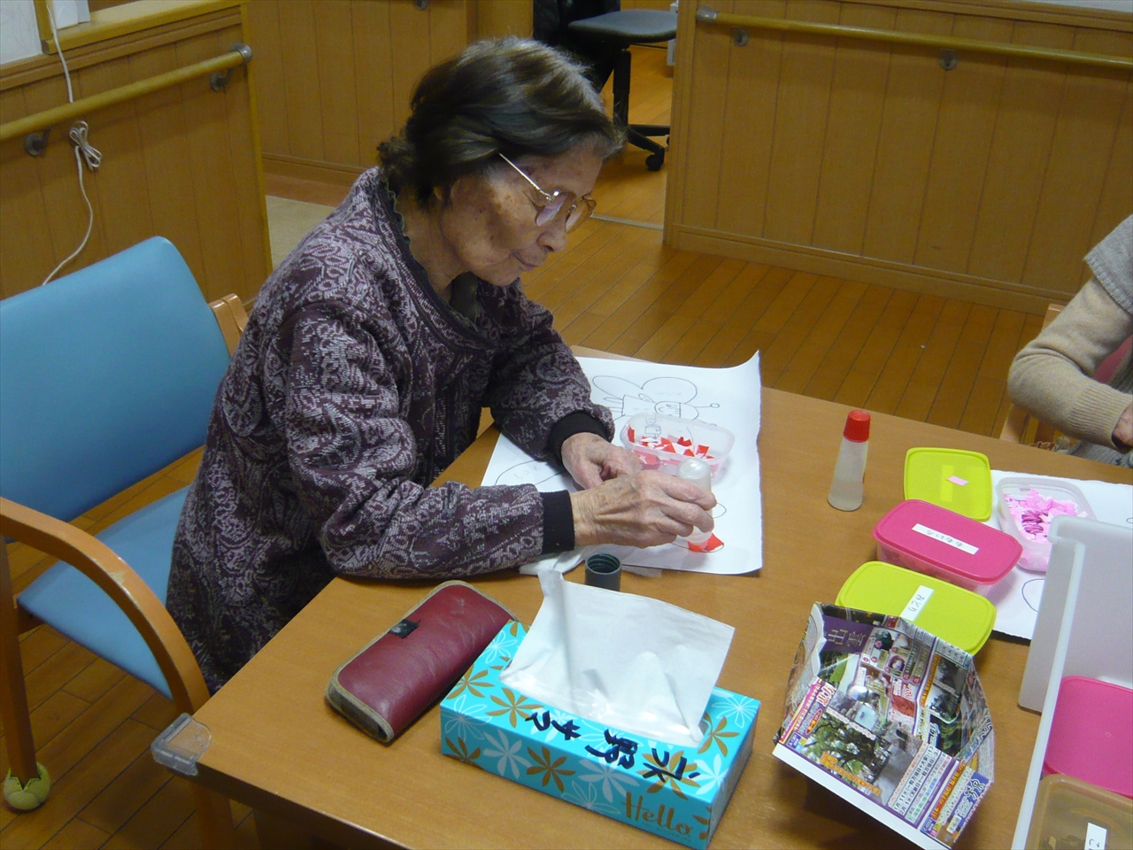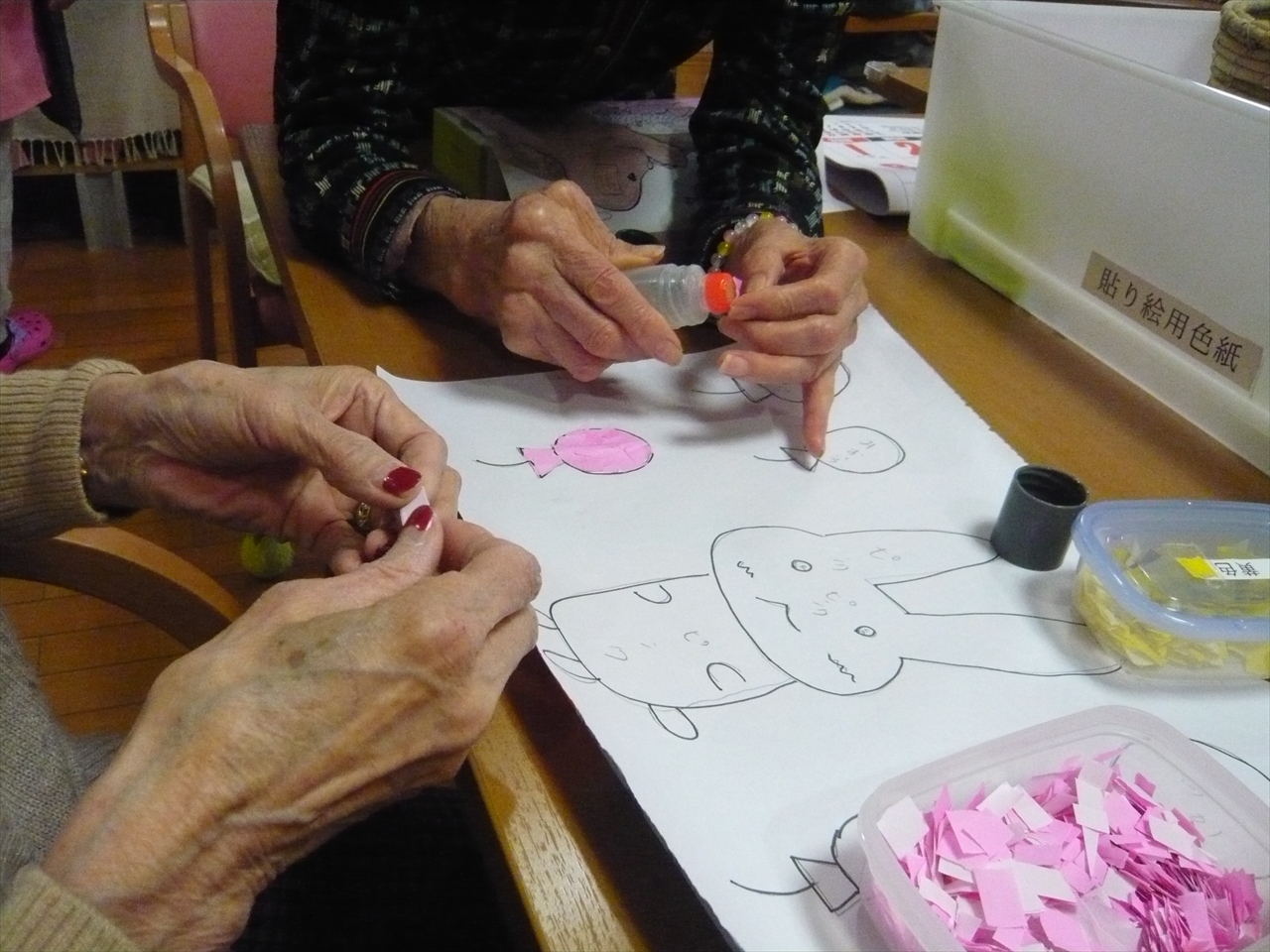 貼り絵中 花の里(2階) 2018.03.2 貼り絵に挑戦中です。 細かい作業で肩が凝ると言われたり、二人で協力し「どうしようか」と相談しながら楽しそうに作業されていました。少しずつ完成させましょう! 3月の壁画作り ふるさと(2階) 前の記事 雛祭り ふるさと(2階) 次の記事