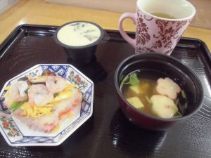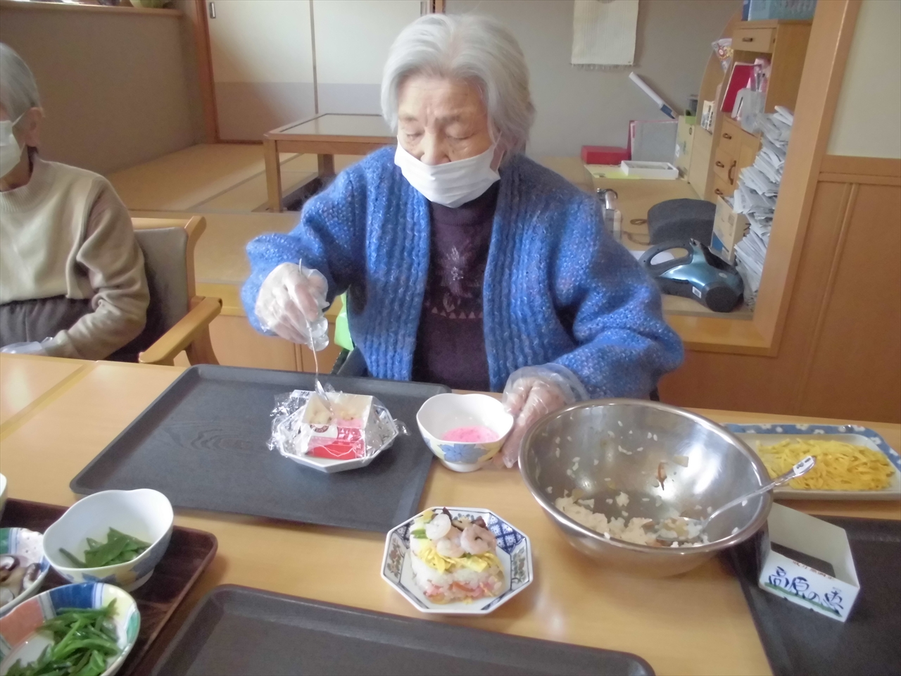 雛祭り ふるさと(2階) 2018.03.3 みんなで押し寿司を作りました。 型にちらし寿司を詰めて卵、シイタケ、エビを盛り付けて完成しました。 おやつにはお雛様とお内裏様のおまんじゅうを美味しく頂きました。 貼り絵中 花の里(2階) 前の記事 雛祭り ふるさと(1階) 次の記事