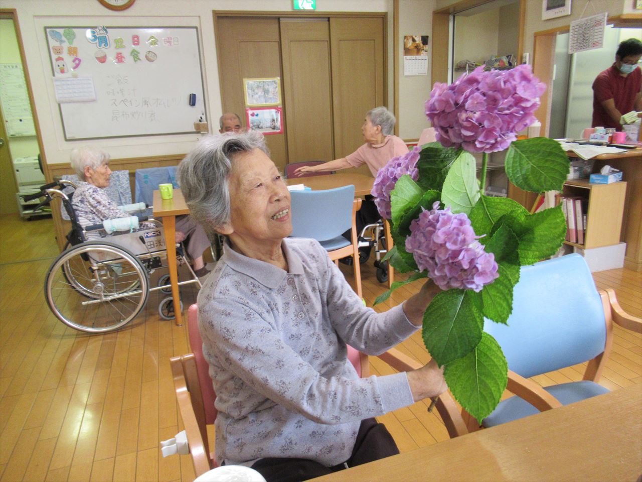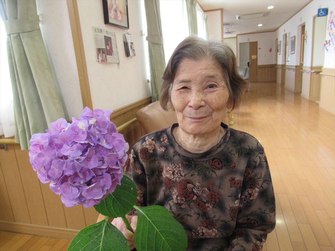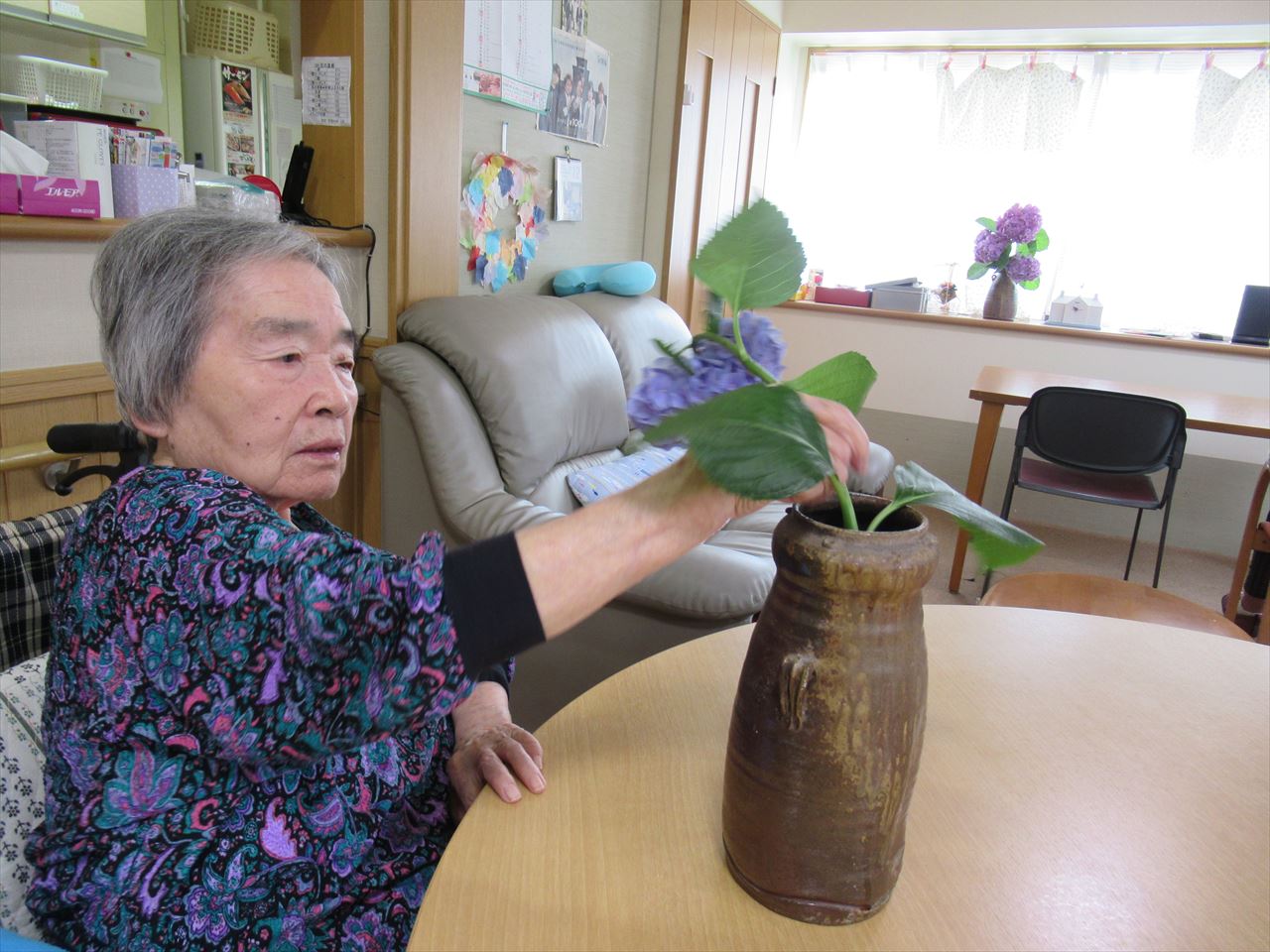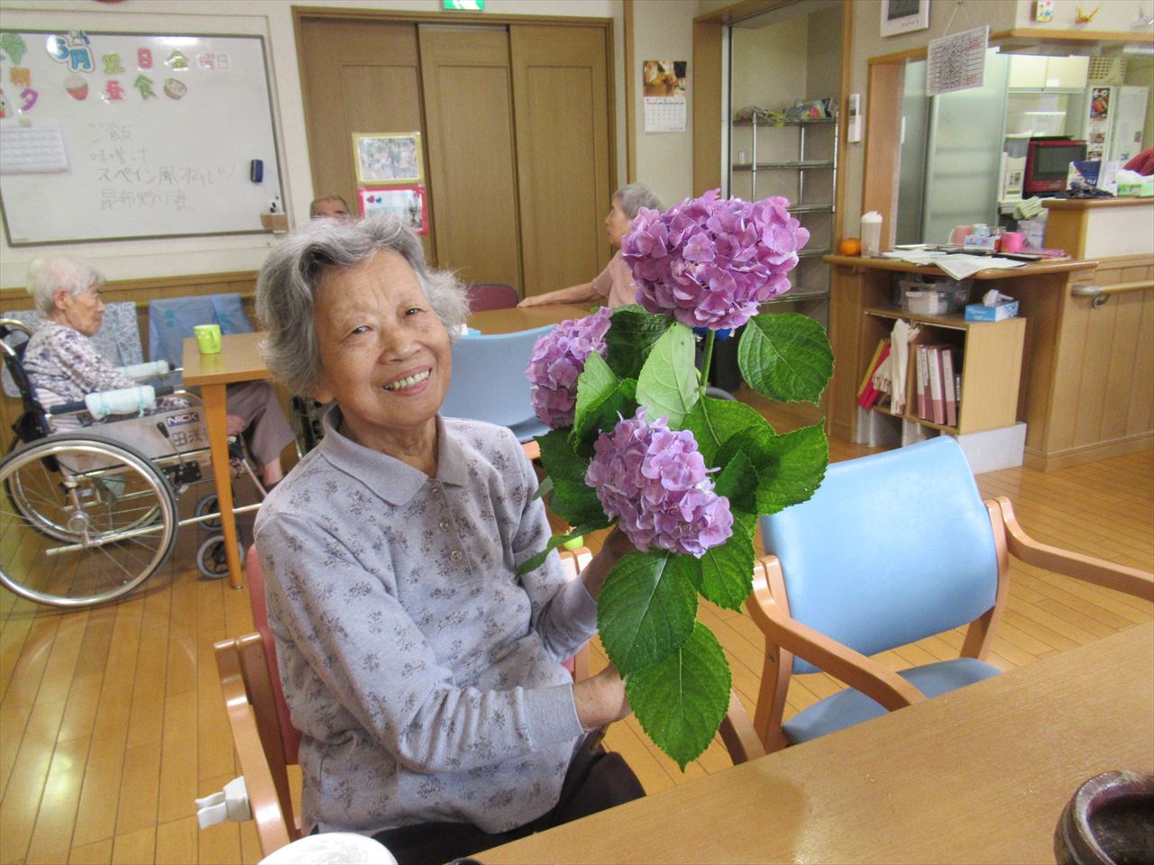 職員の一人が、家の庭で咲いていた紫陽花の花をたくさん持って来てくれたので、みんなで活けました。大きな花を付けており、きれいじゃと喜んでおられました。 花の里の紫陽花も花は小さいですが、可愛く咲いており、外に出るたびに皆さん喜んで見てくれています。 駐車場の、日当たりの良い場所にお試しにひまわりの種を植えてみました!まだ一週間経っていないのですが、芽が出ていました。野菜同様無事に育ってくれると嬉しいです。