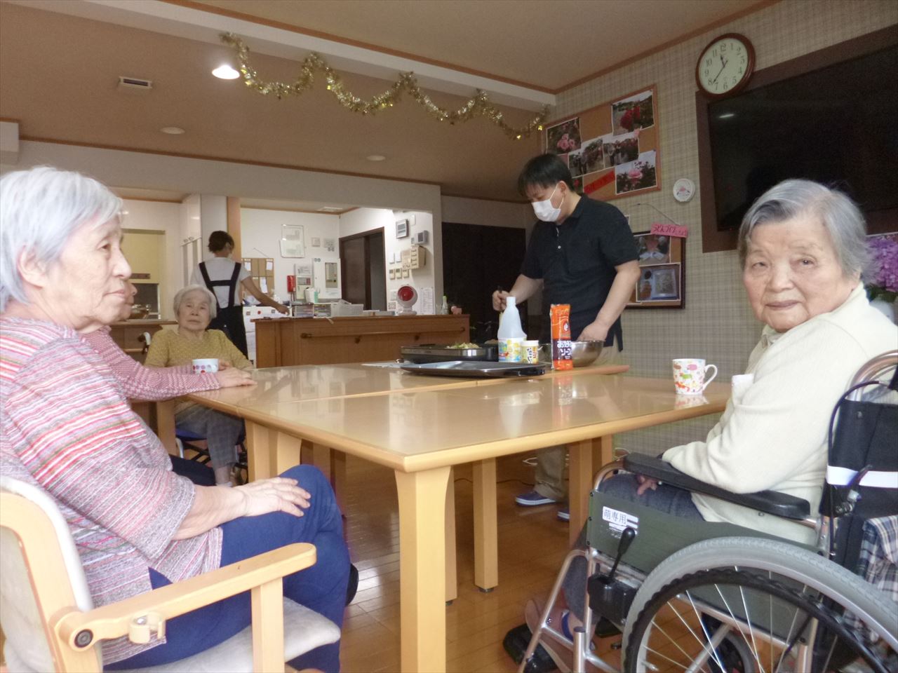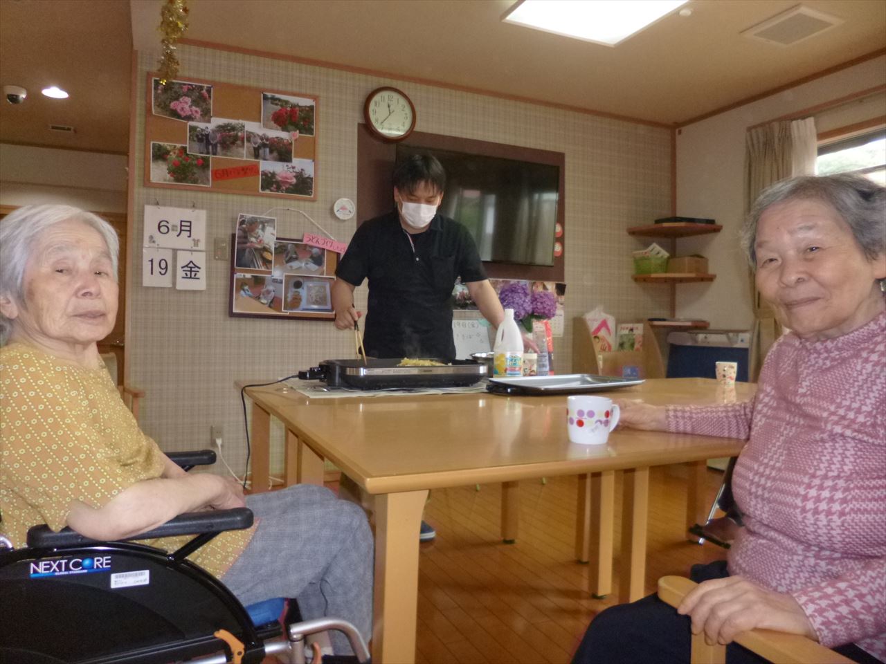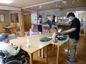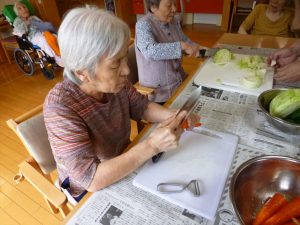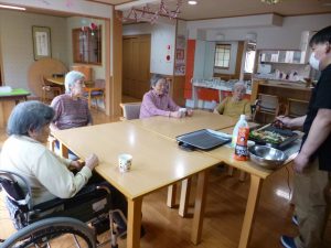 さぁさぁやってきました“昼食作り”本日のメニューは“焼きそば”。下ごしらえはみなさんで、調理は目の前で職員によるCooking Show !