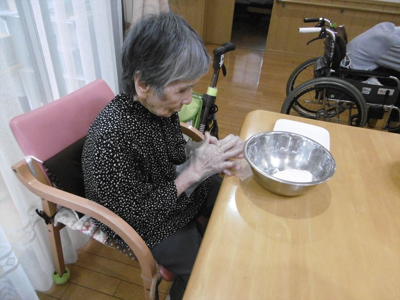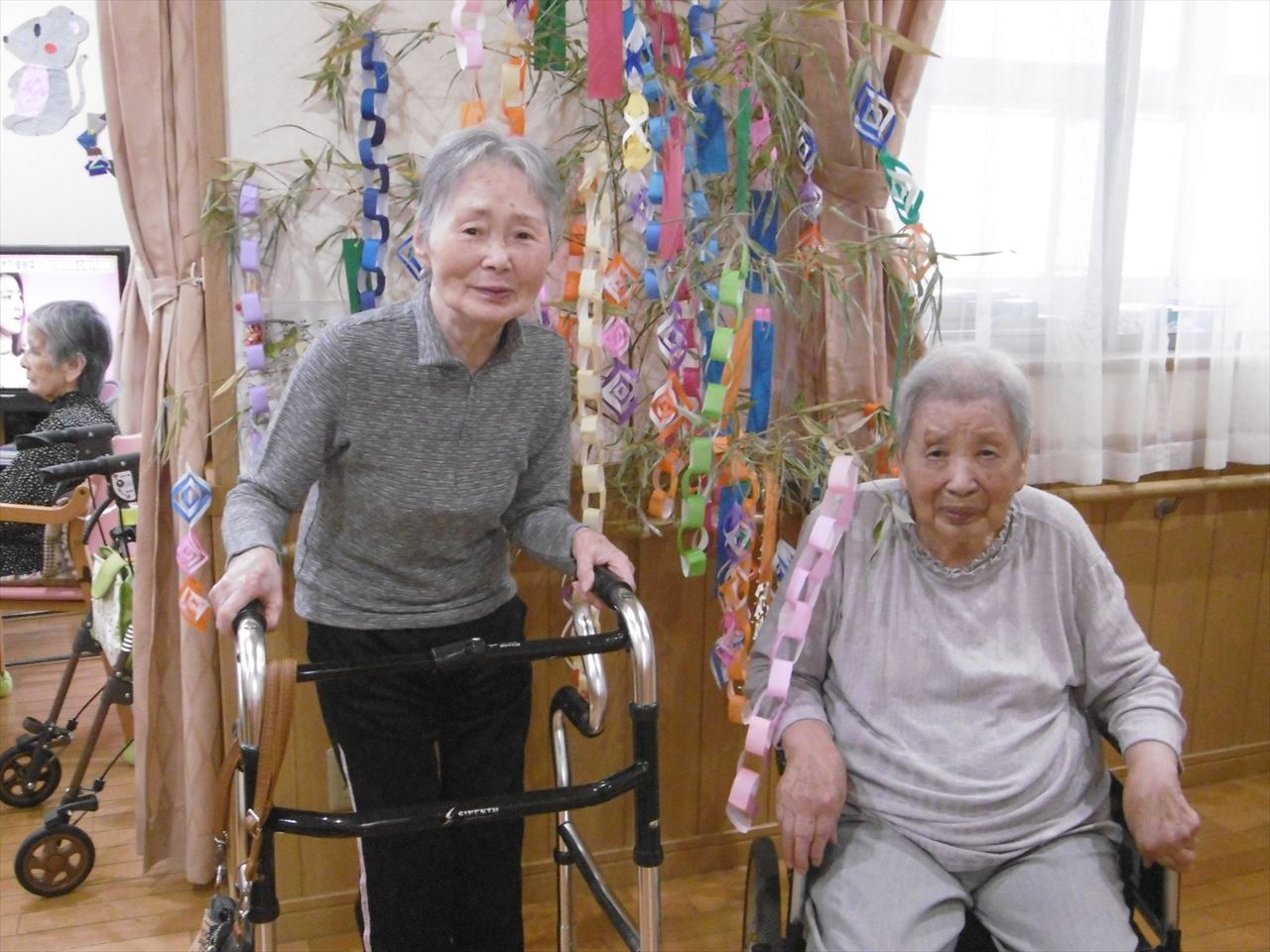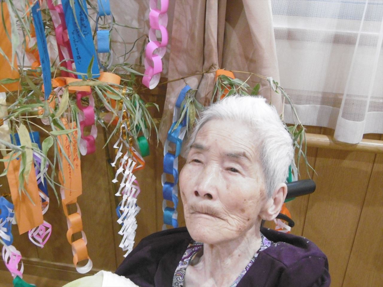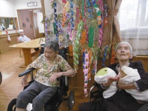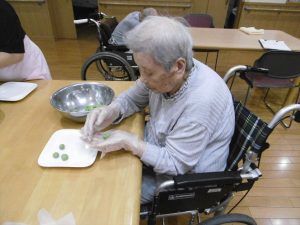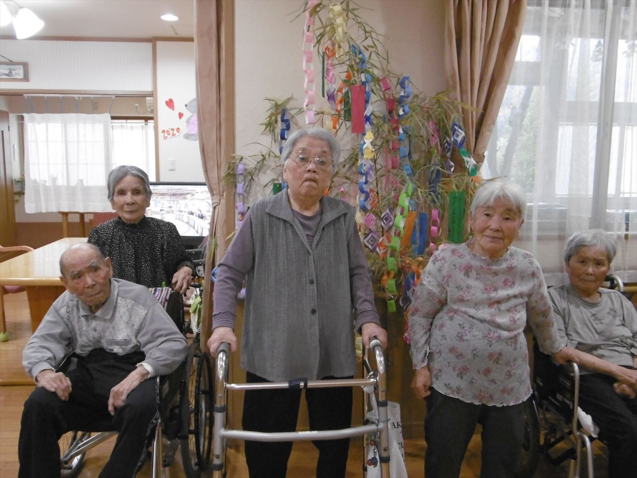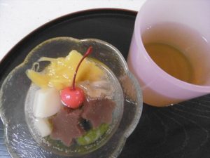 おやつの時間に、手作りのようかんを星型にカットし、皆さんには白玉粉に抹茶粉を混ぜてもらい、それもトッピングしました。きれいに仕上がったおやつをみんなで食べたあとに、七夕飾りの前で記念撮影をしました。雨が続きますが、何事もありませんように…。