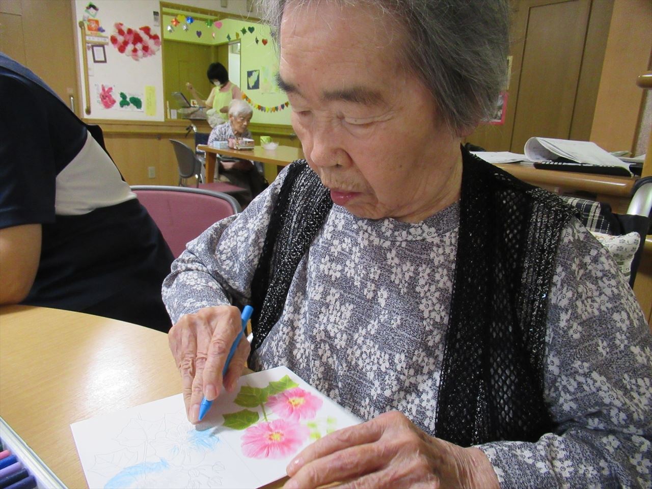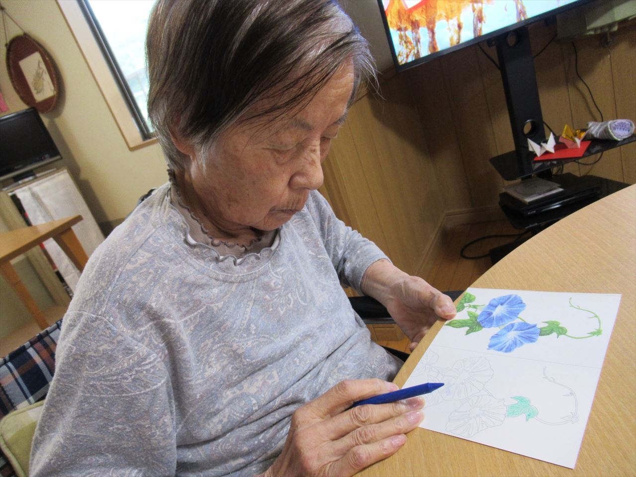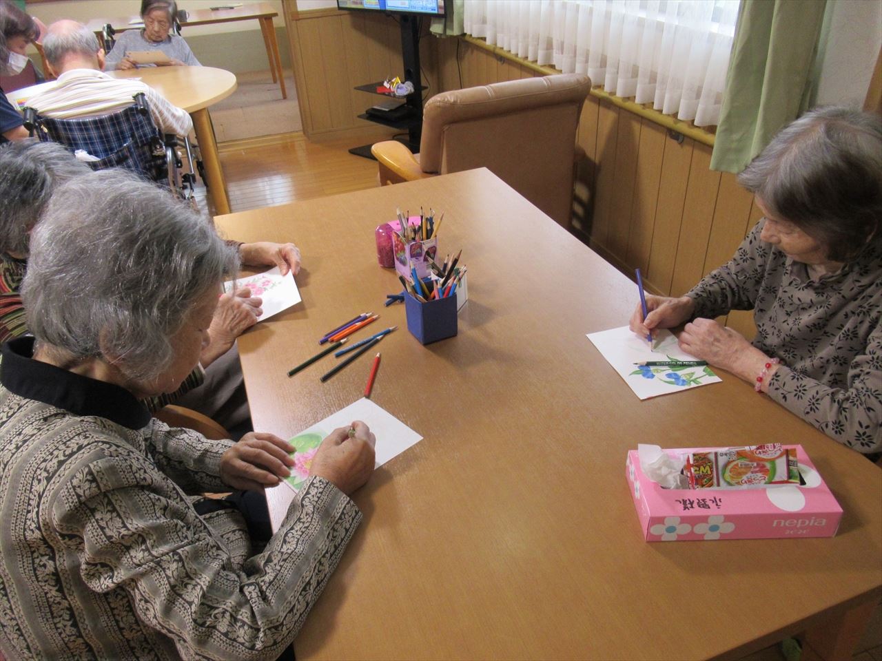今日はご家族宛の残暑見舞いのはがきの作成を皆さんで行いました。皆さん一生懸命色塗りを行って下さいました。