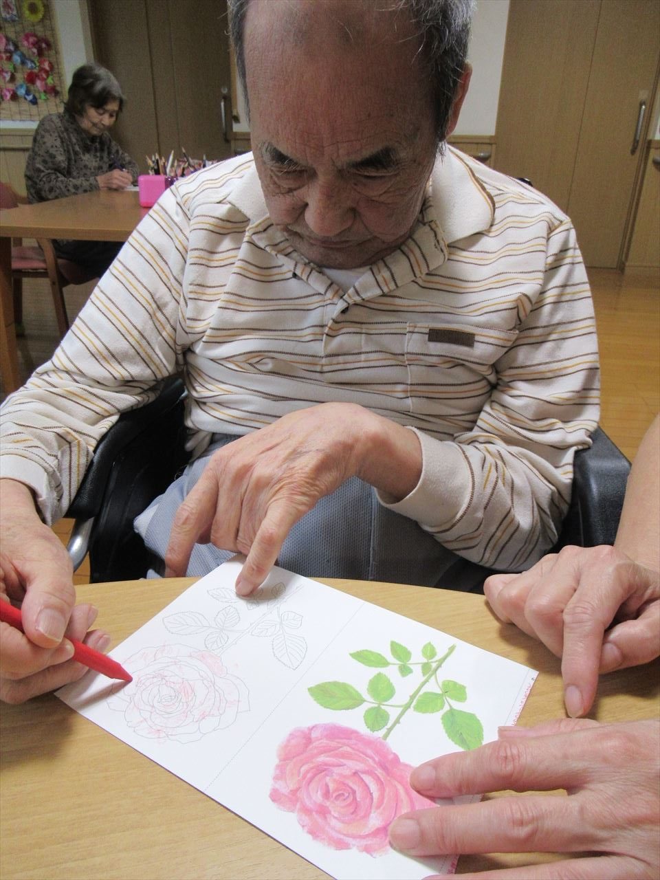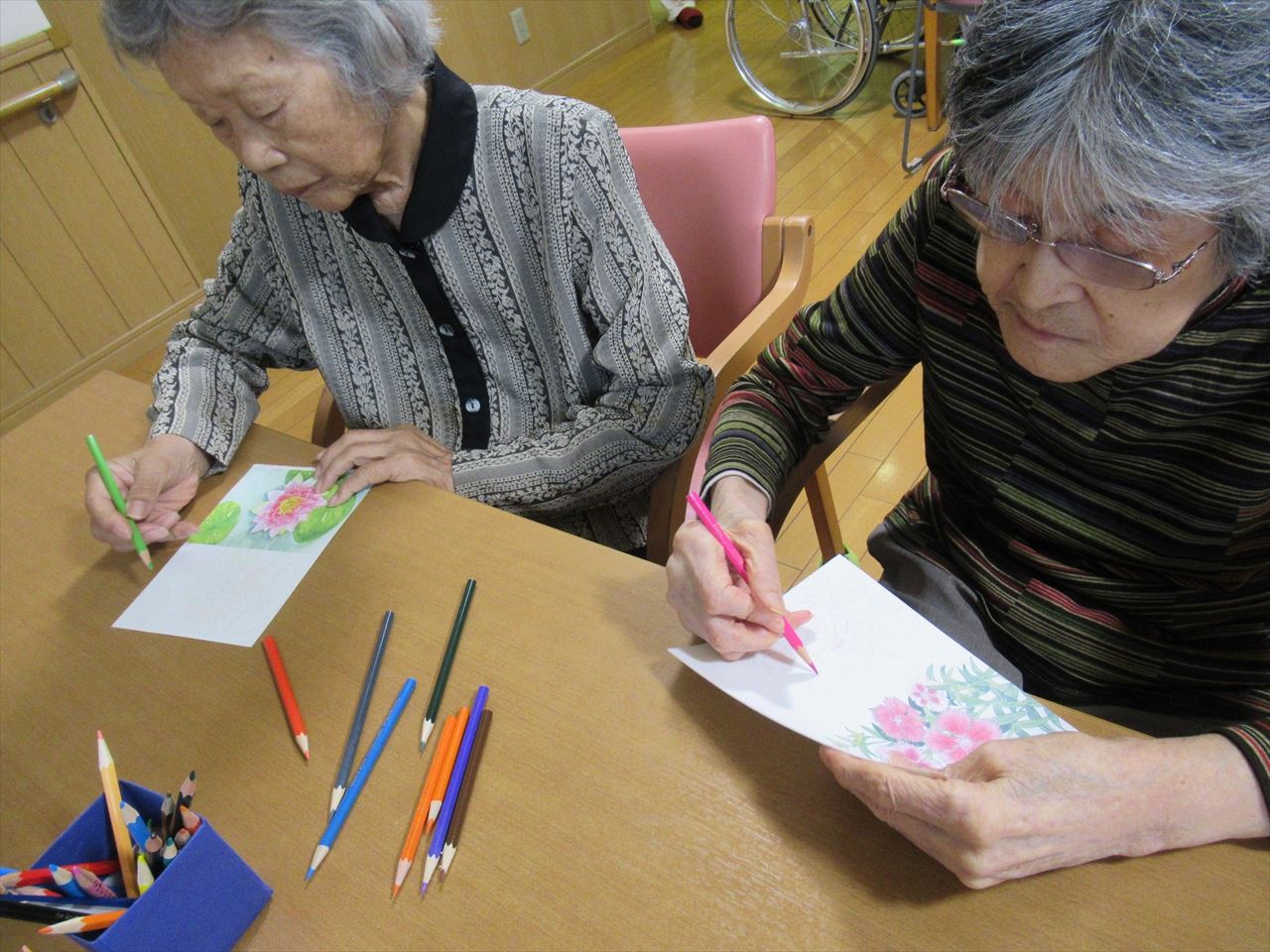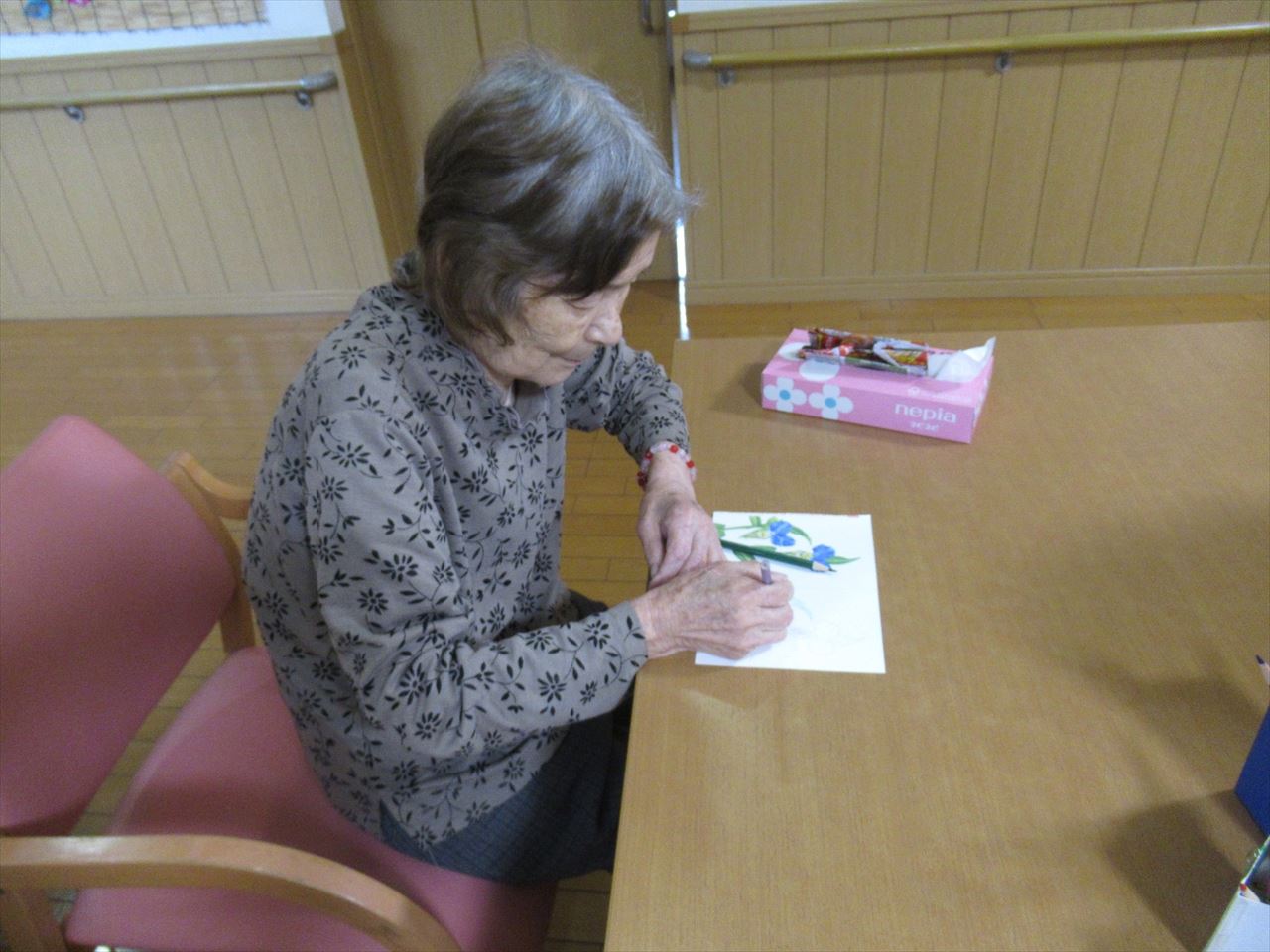 今日はご家族宛の残暑見舞いのはがきの作成を皆さんで行いました。皆さん一生懸命色塗りを行って下さいました。