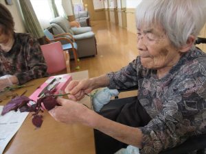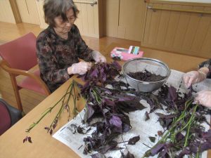 今日はみんなでしそジュース作りを行いました。購入した赤しそをちぎってもらい、お鍋で煮詰めて砂糖とお酢で味を整えました