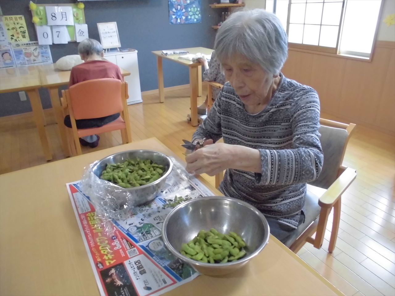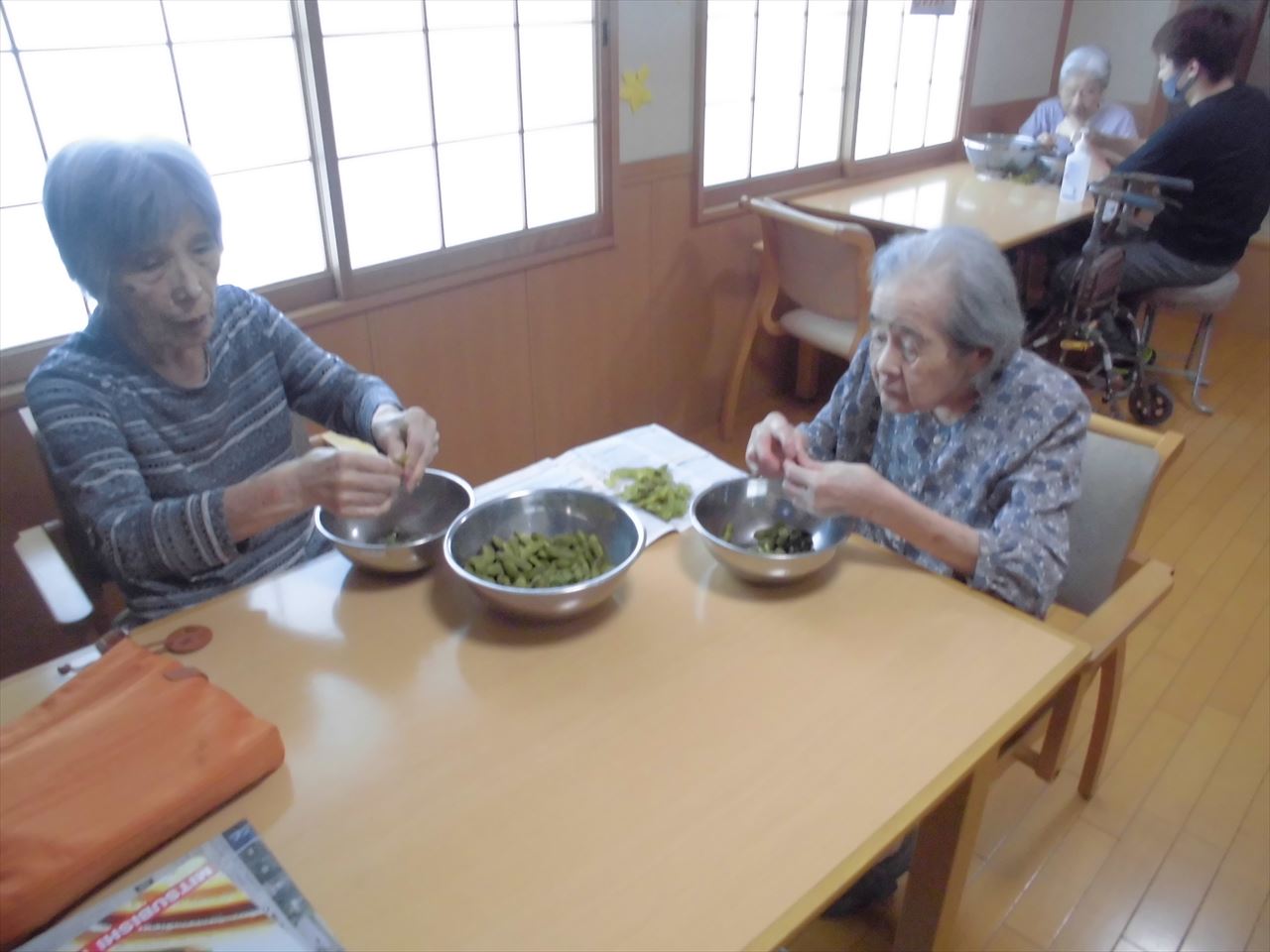 畑で採れた枝豆の下処理をしていただき、豆ごはんにしてみんなで美味しくいただきました!
