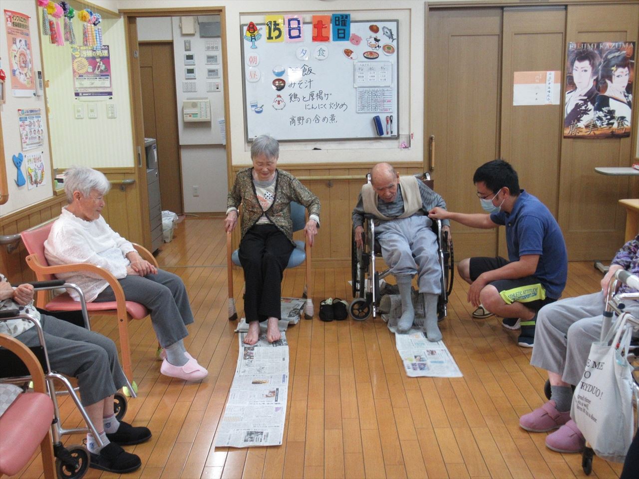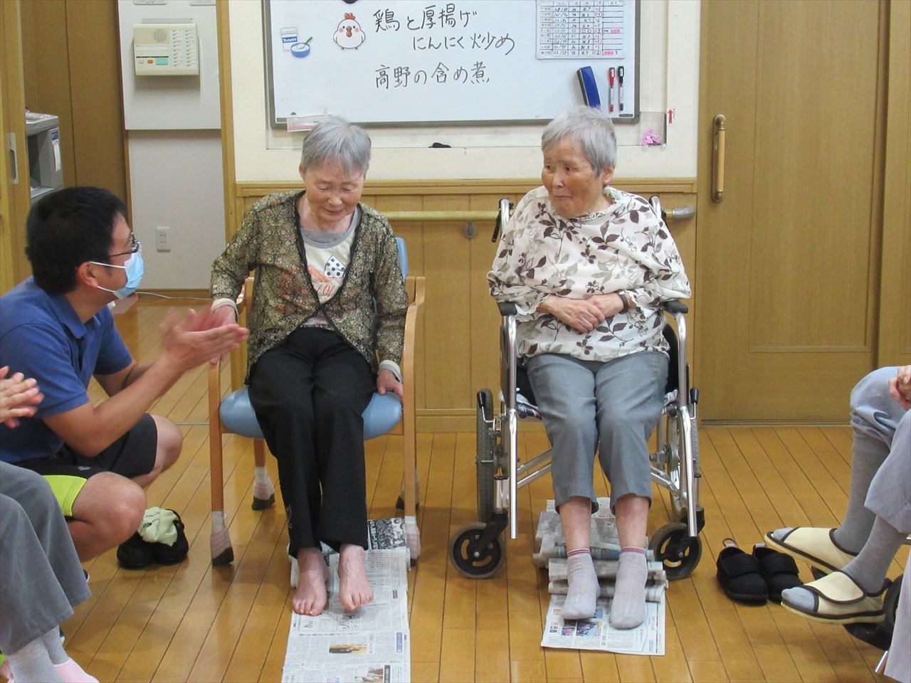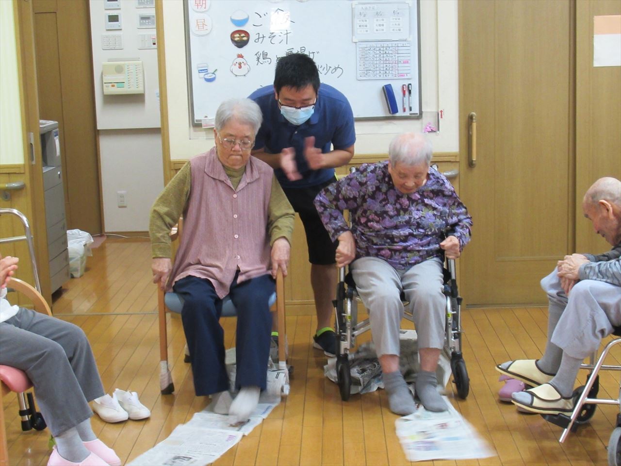 今日は足を使って新聞紙を自分の所へ巻き取るレクをしてみました!
