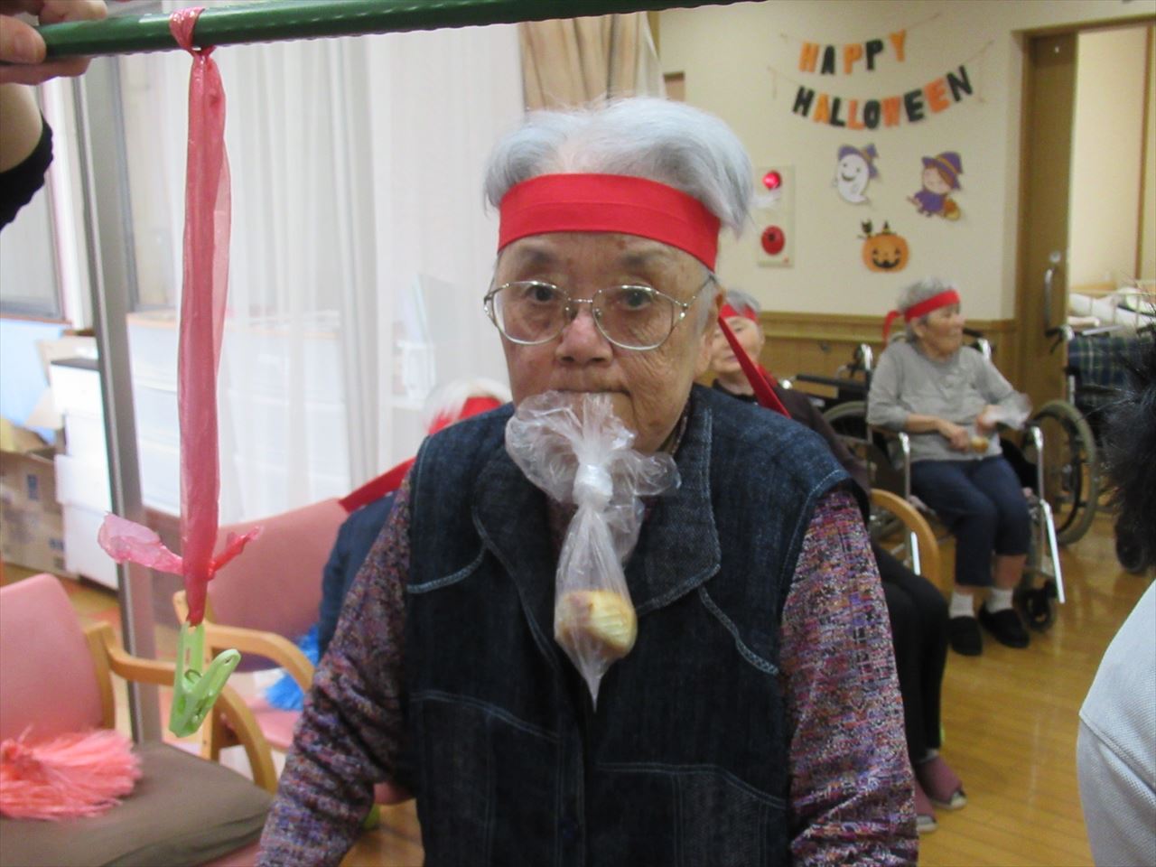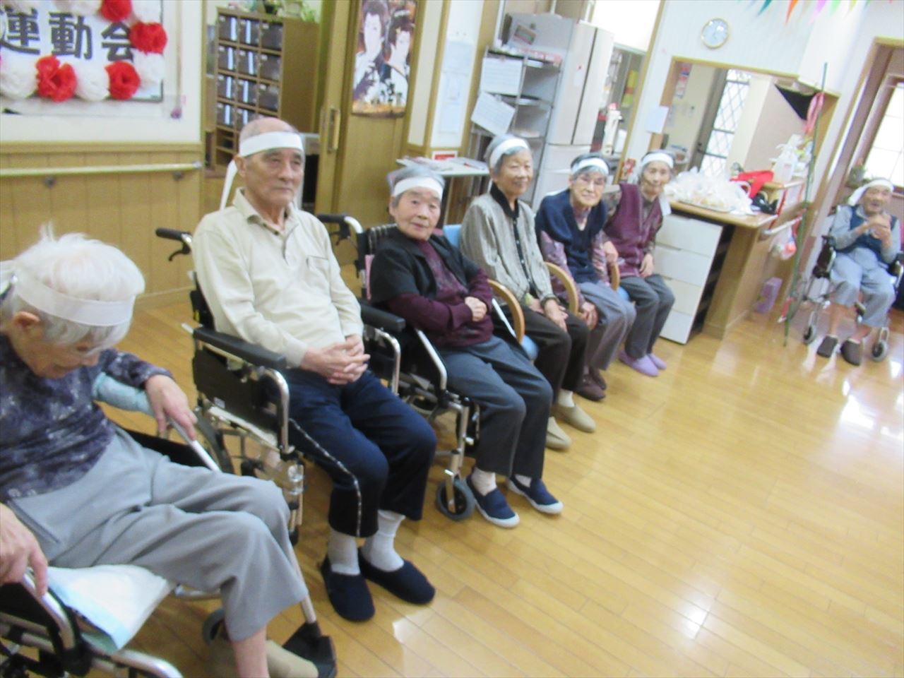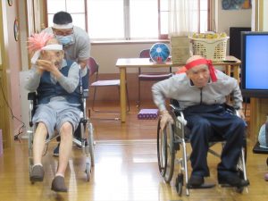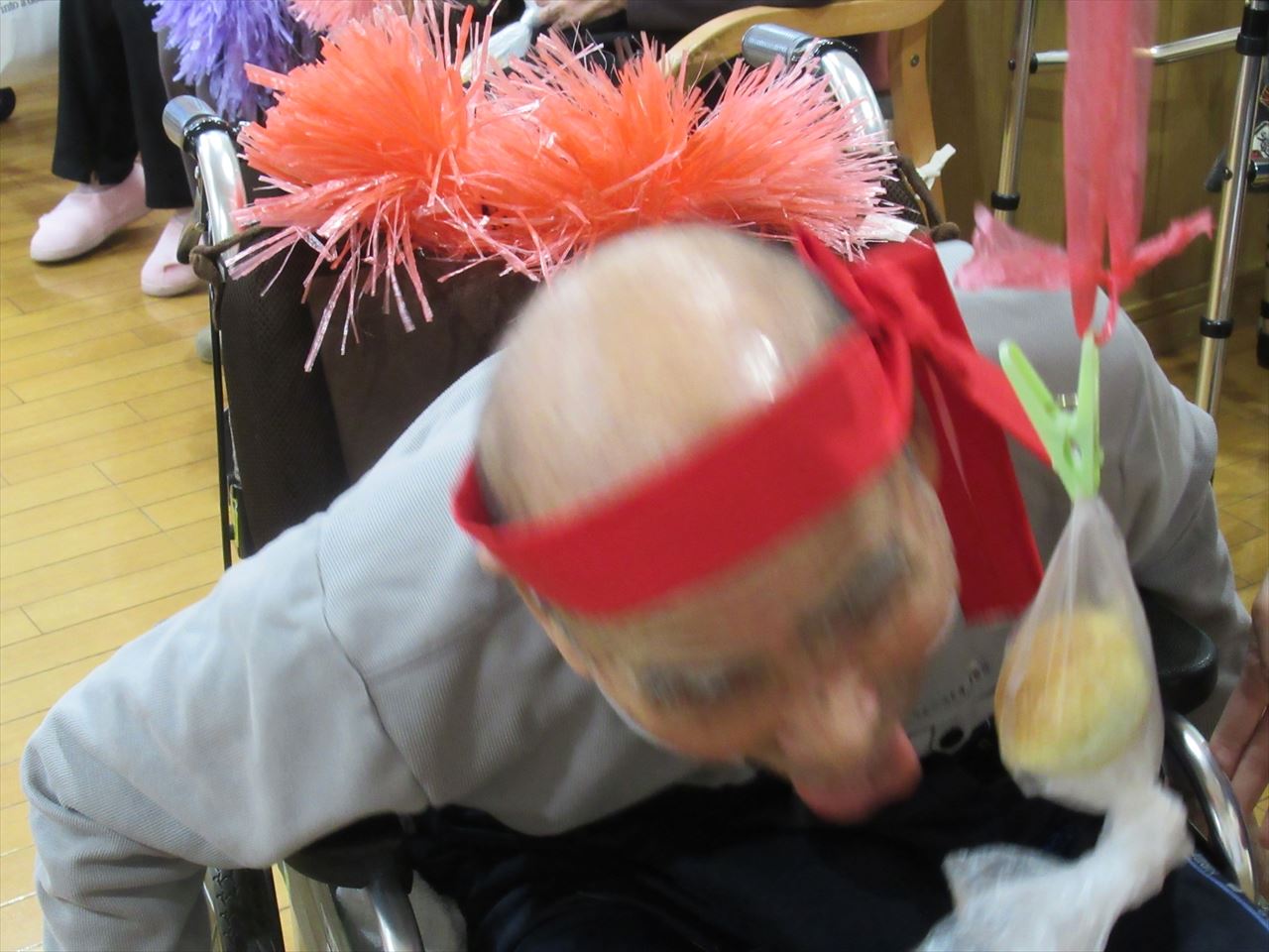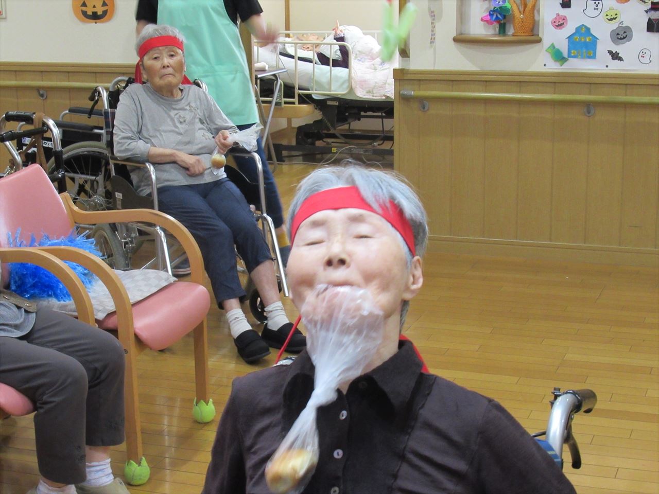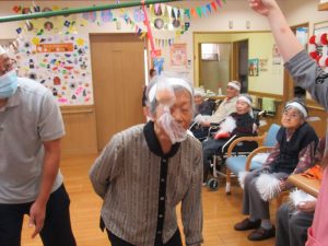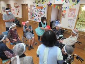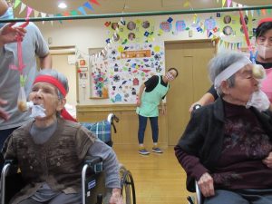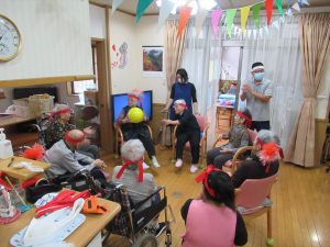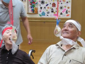 今日は一階、二階のみんなで運動会を行いました。ラジオ体操で準備運動をした後にパン食い競争、ボール回し、玉入れの三種目を赤白チームに分かれて競争しました。
