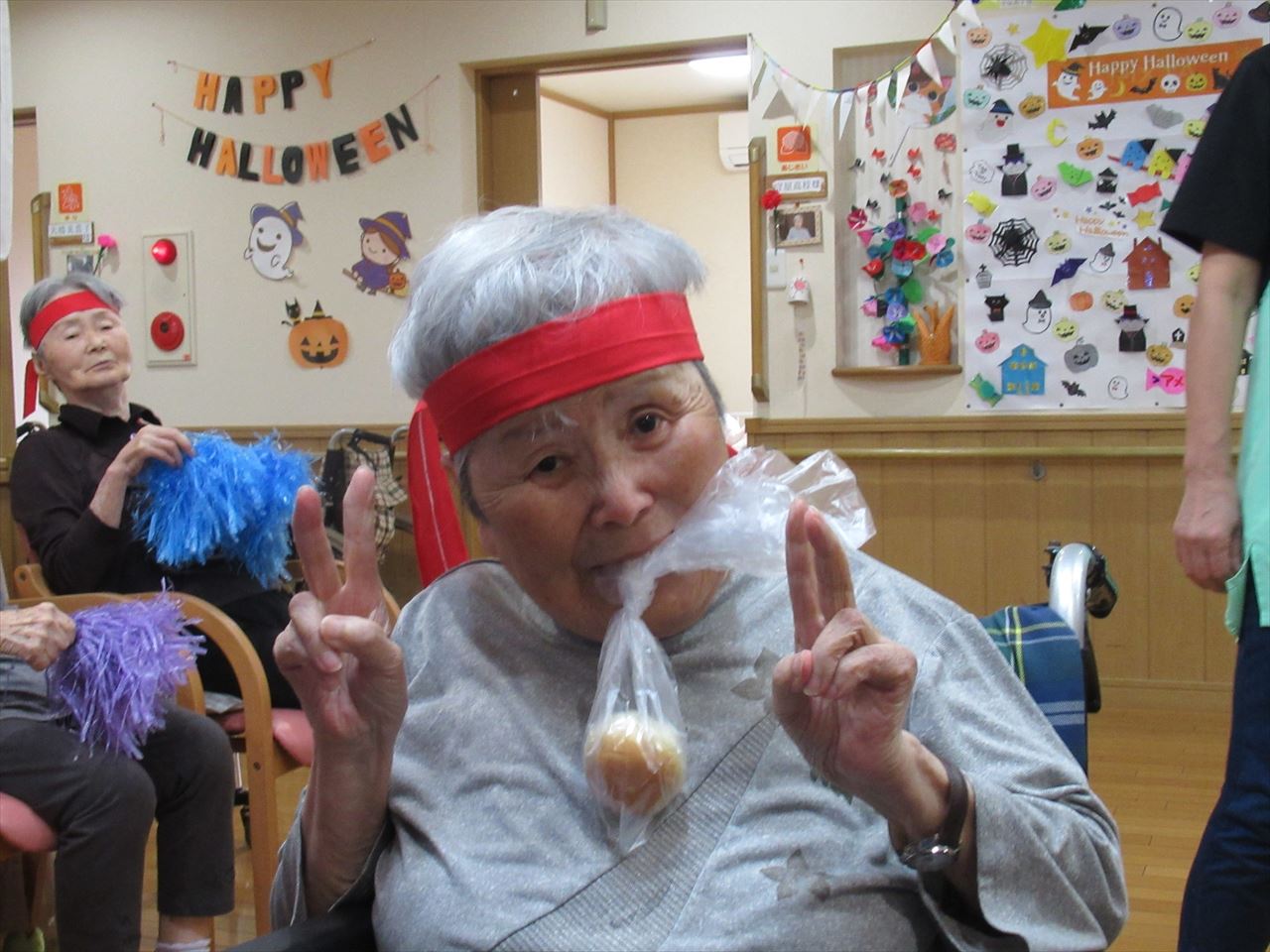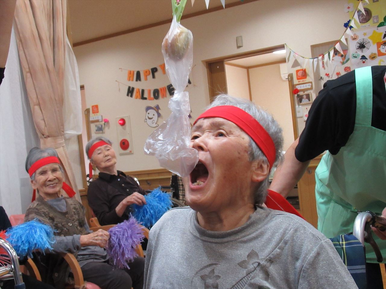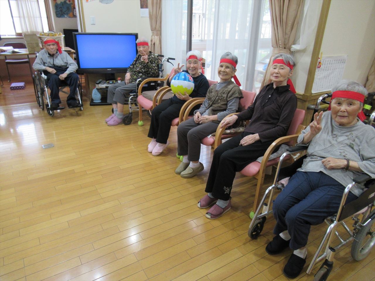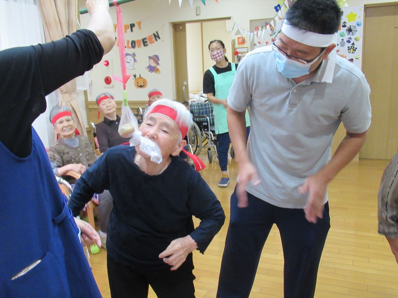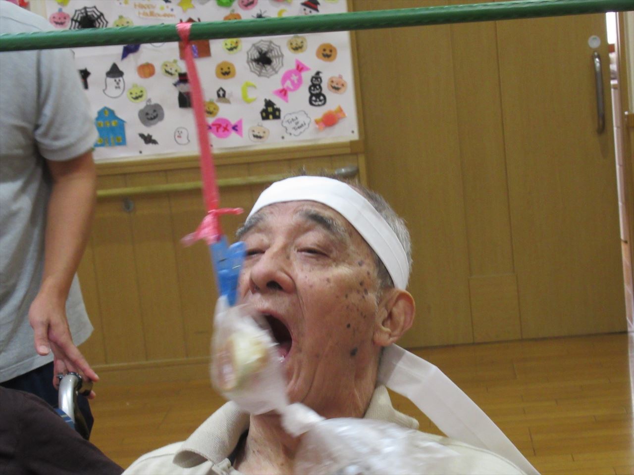 今日は一階、二階のみんなで運動会を行いました。ラジオ体操で準備運動をした後にパン食い競争、ボール回し、玉入れの三種目を赤白チームに分かれて競争しました。