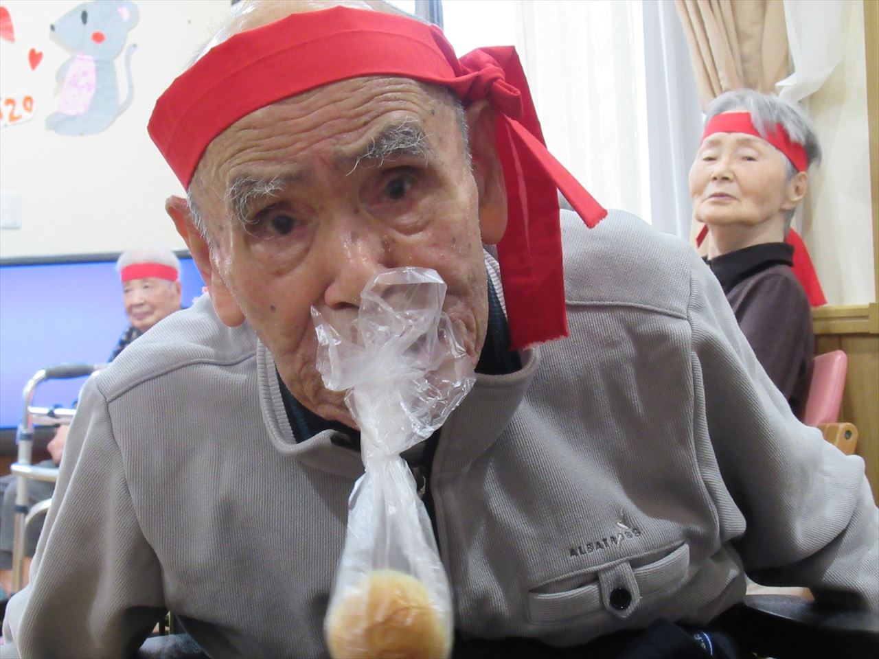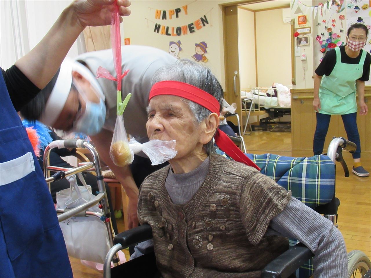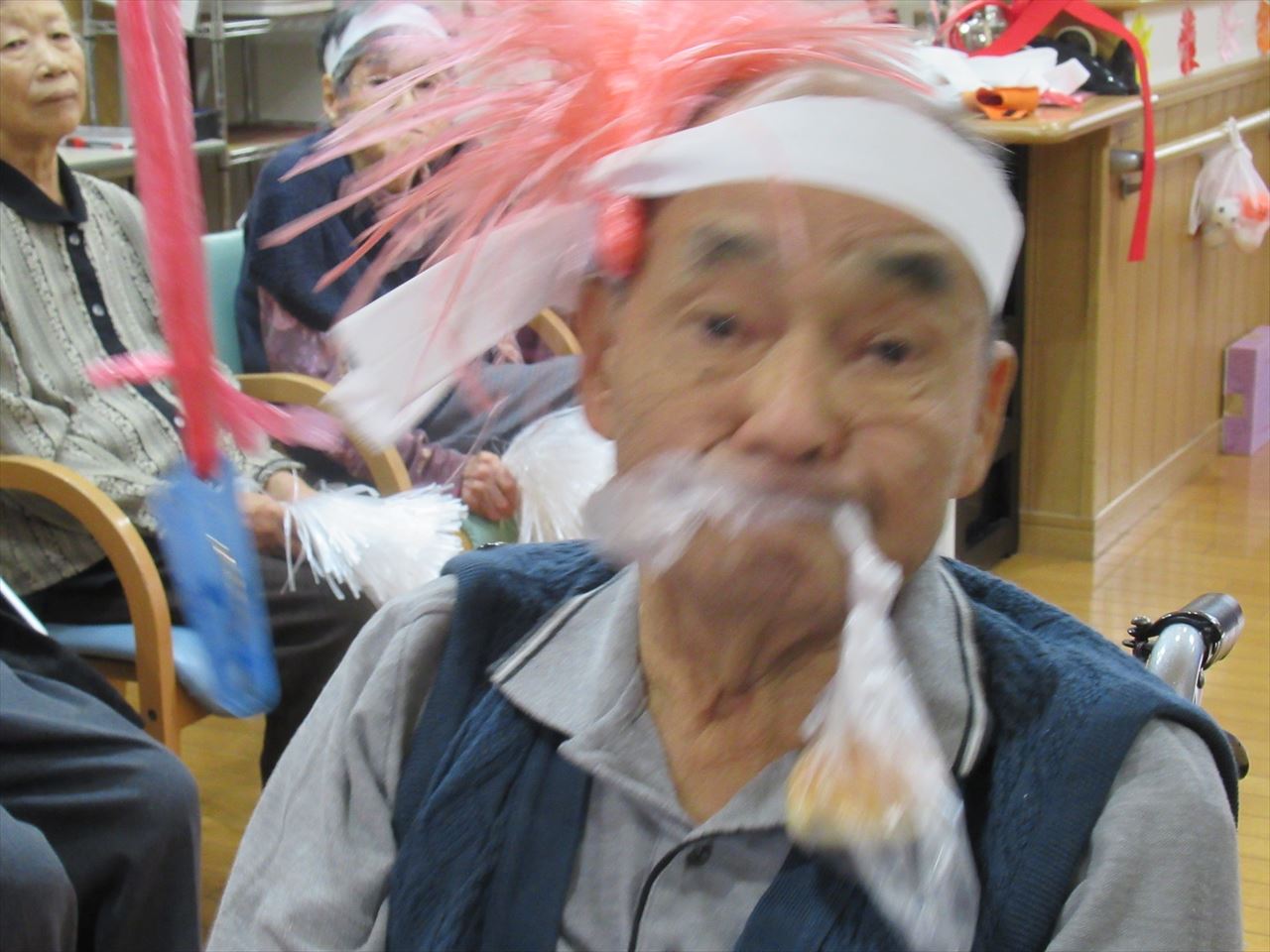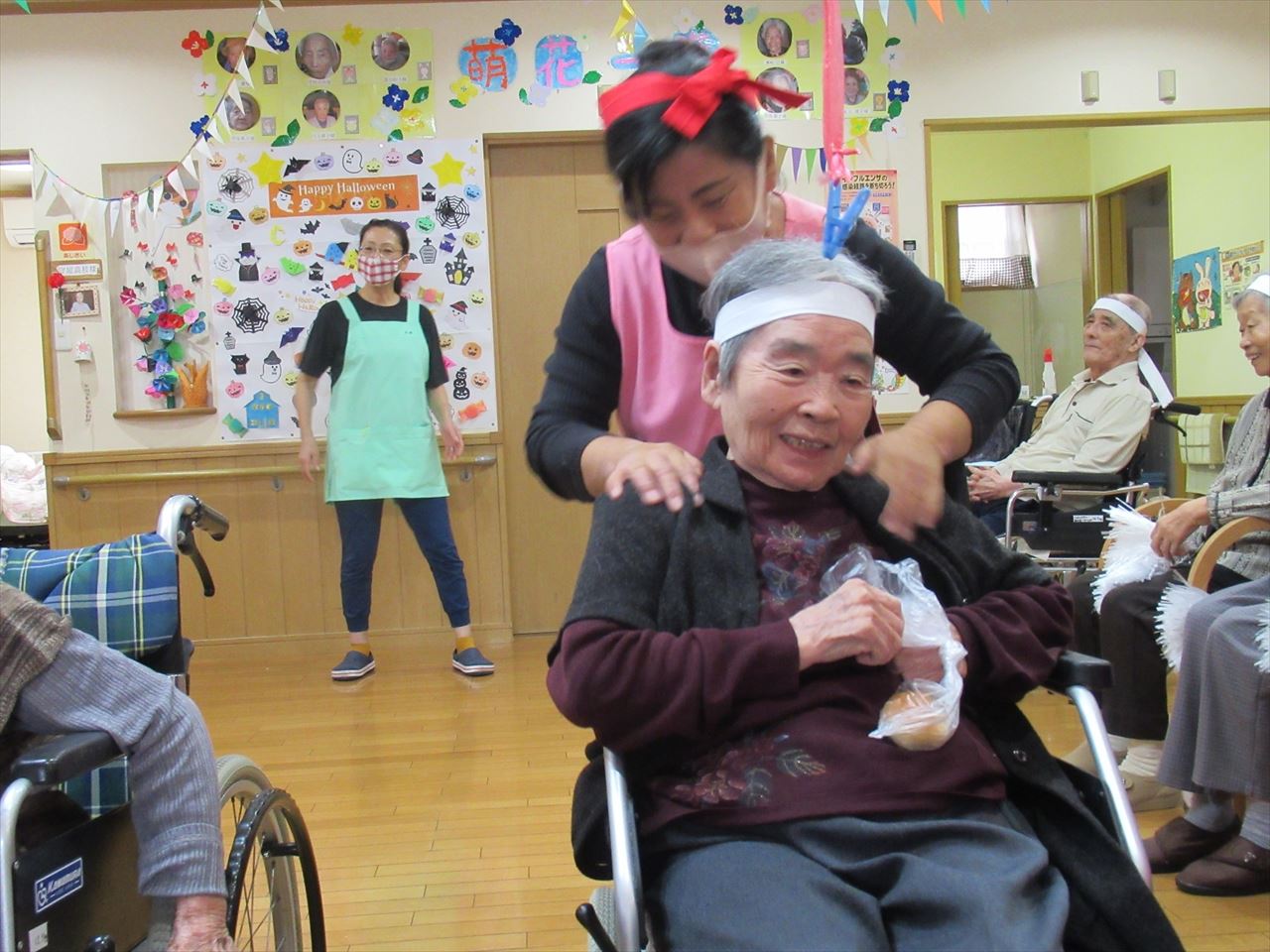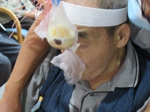 今日は一階、二階のみんなで運動会を行いました。ラジオ体操で準備運動をした後にパン食い競争、ボール回し、玉入れの三種目を赤白チームに分かれて競争しました。