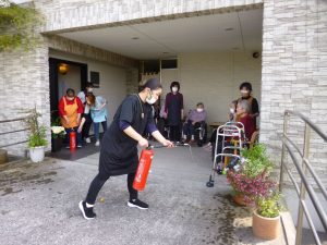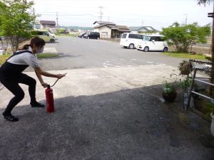 素早く避難ルートを確保し、皆さんと職員とで消火器訓練も行いました。
