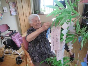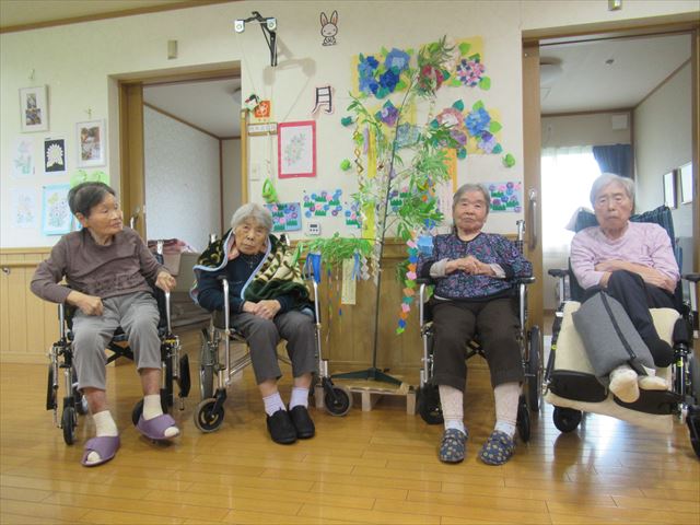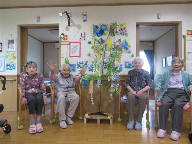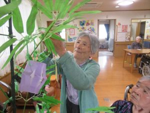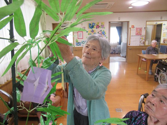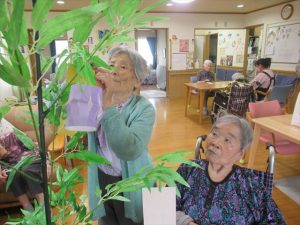 七夕会(花の里2階) 2023.07.5 今年の七夕は少し早めの5日に楽しまれました。 それぞれのお願いを書いた短冊や飾りを笹に結び「きれいだね」「いいもんだね」とお互いに感想を話しながら楽しく過ごされました。 6月の日常風景(花の里2階) 前の記事 七夕飾りつけ(花の里1階) 次の記事