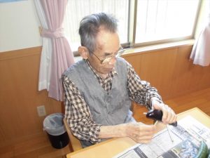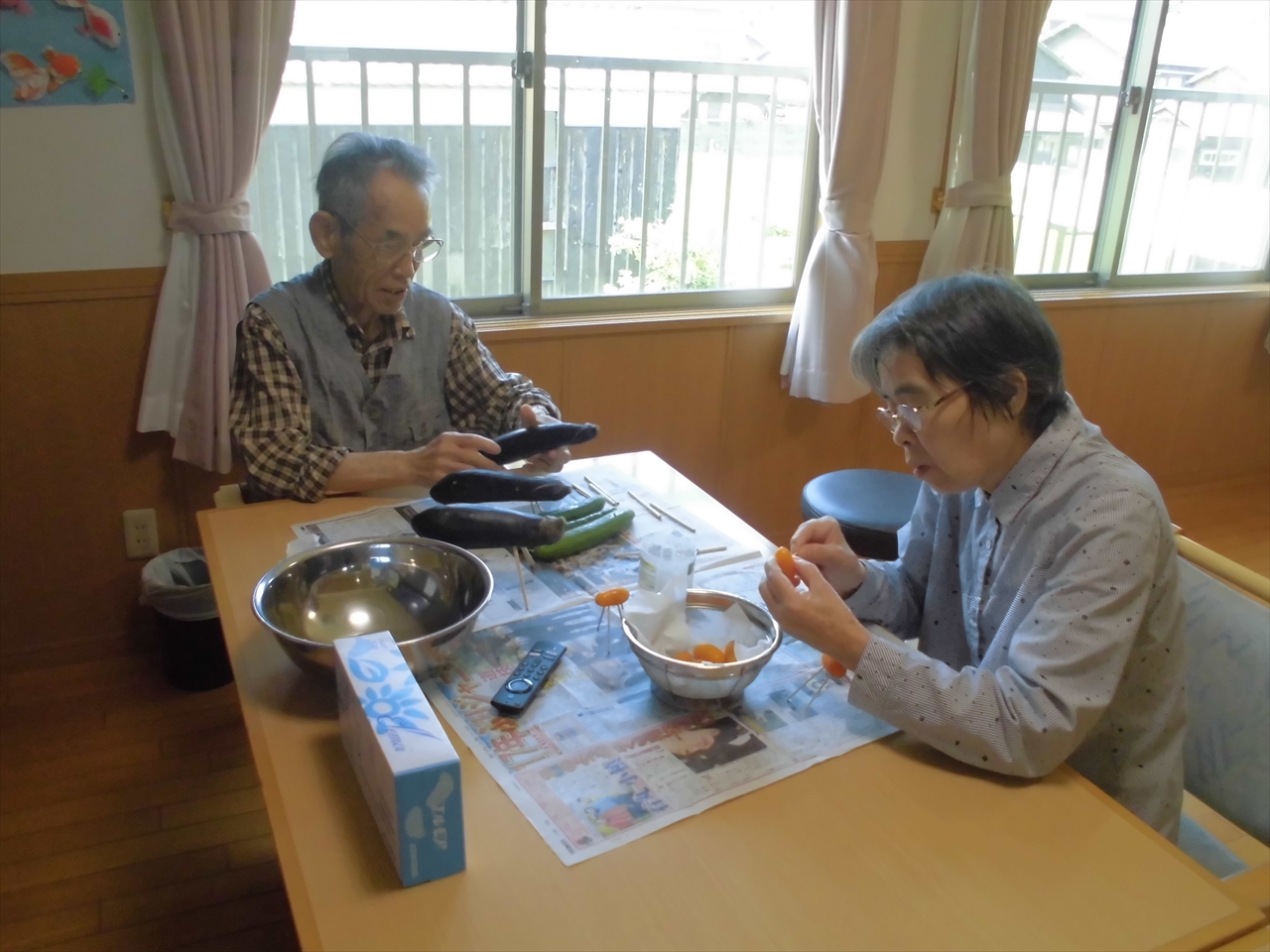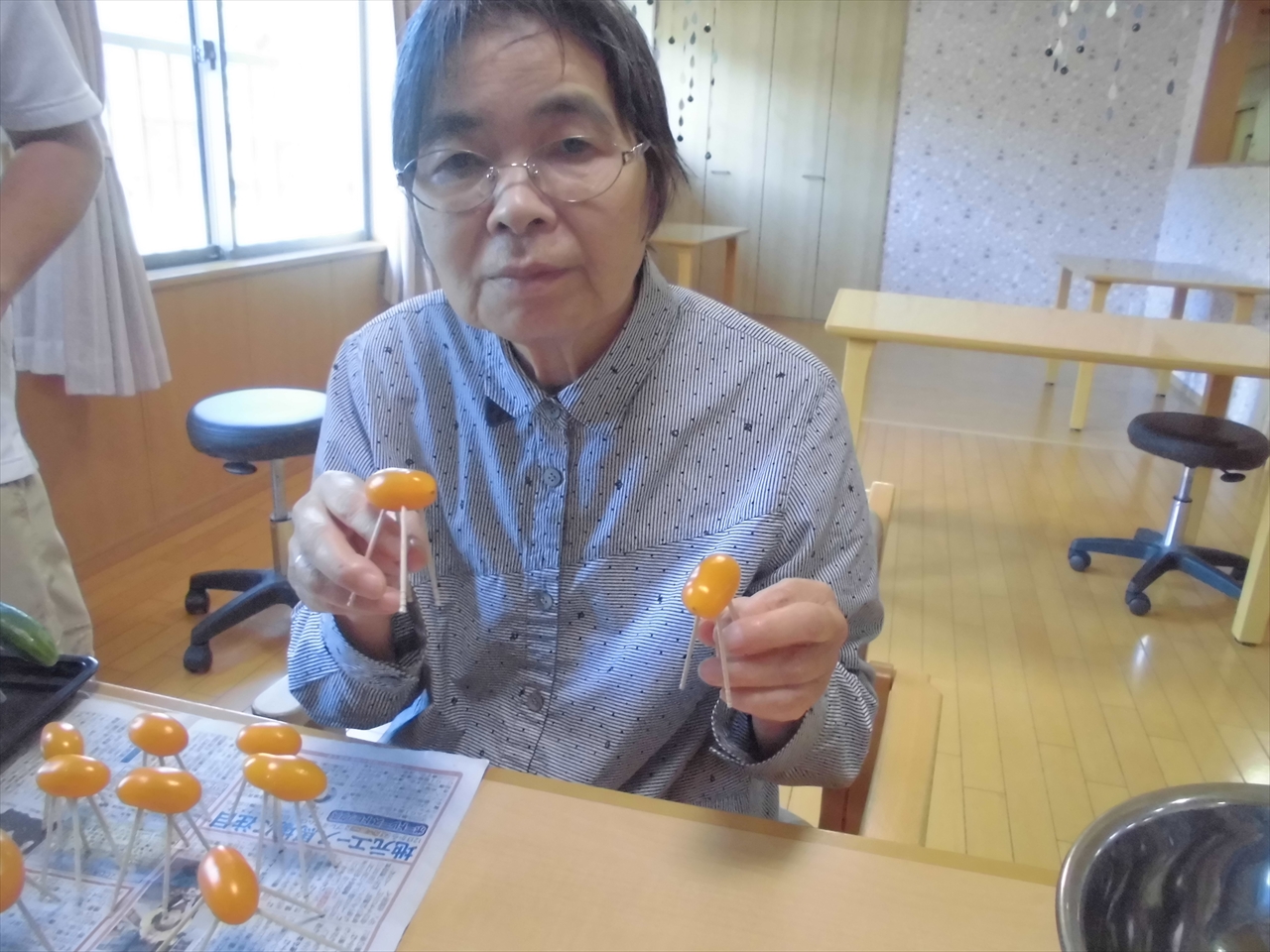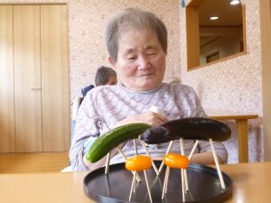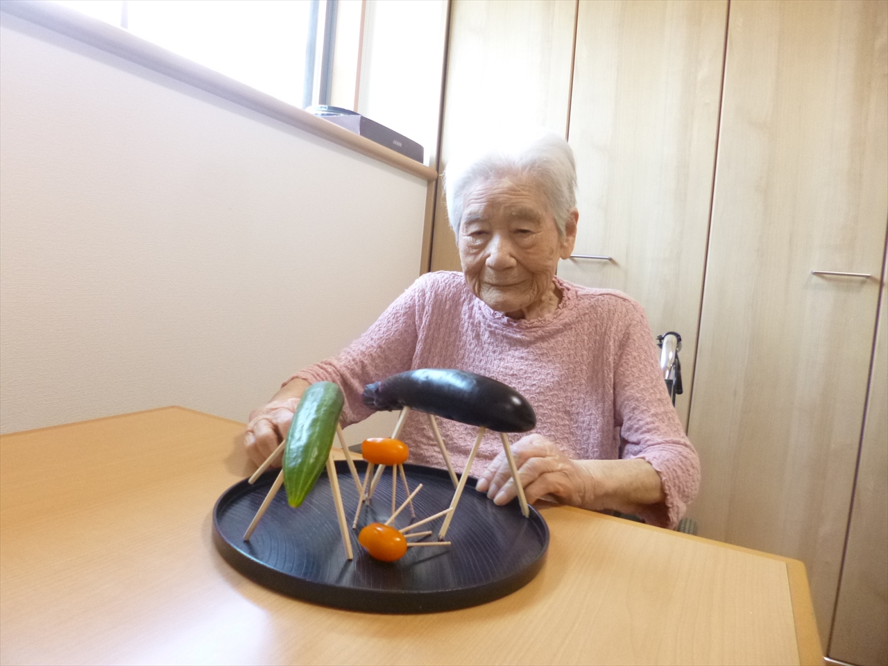 皆さんでナスやキュウリを使った精霊馬を作成しました。